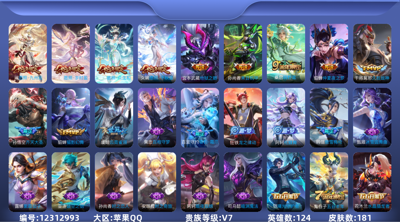 [12312993]V7 12传说 124英雄 181皮肤 可修改实名 优质装备:猫影幻舞,久胜战神,云霓雀翎,末日机甲-孙尚香(绿蚂蚱),仲夏夜之梦(大飞蛾),地狱之眼 珍宝阁皮:蔷薇恋人 限定皮:愿照·九州拓(澜年限),愿照·岁时盈(虞姬年限),愿照·众生和(妲己年限),愿照·千秋盛(女娲年限),逐霄战戟,鸣野蒿,傲雪梅枪,齐天大圣,五谷丰年 史诗皮:绮世丹青,化蝶舞,龙之律动,雪豹·霜爪,茶境仙,撼地雄心,破空之剑,百相守梦-百里守约,星界特工,百相守梦-黄忠,紫霞仙子,特工魅影,千年之狐,江河有灵,真我赫兹(百里守约),青蛇,暗夜猫娘,末日机甲-吕布,猫狗日记-孙策,时之恋人-孙尚香,水果甜心,时之奇旅-安琪拉,功夫厨神,鬼剑武藏,暗渊魔法,心灵战警,水晶猎龙者,曙光守护者,唤灵魅影,圣诞恋歌,鹰眼统帅,魅力维加斯,未来纪元-赵云