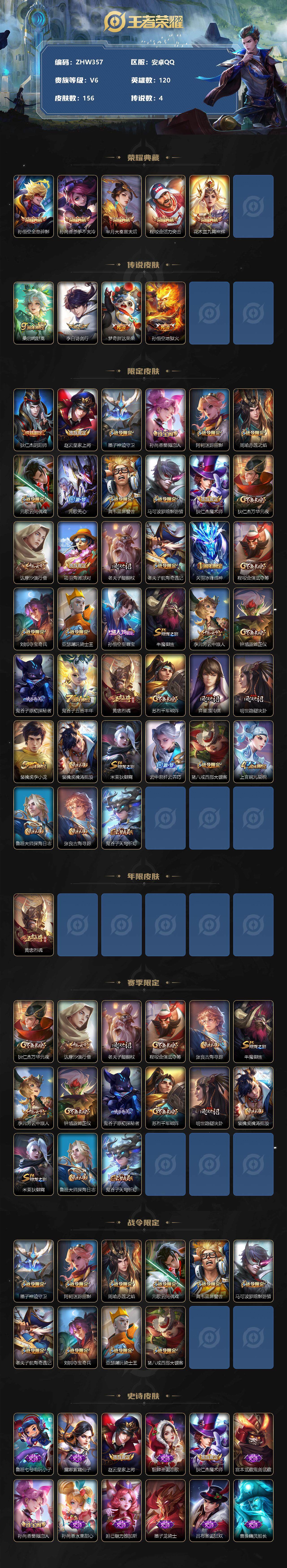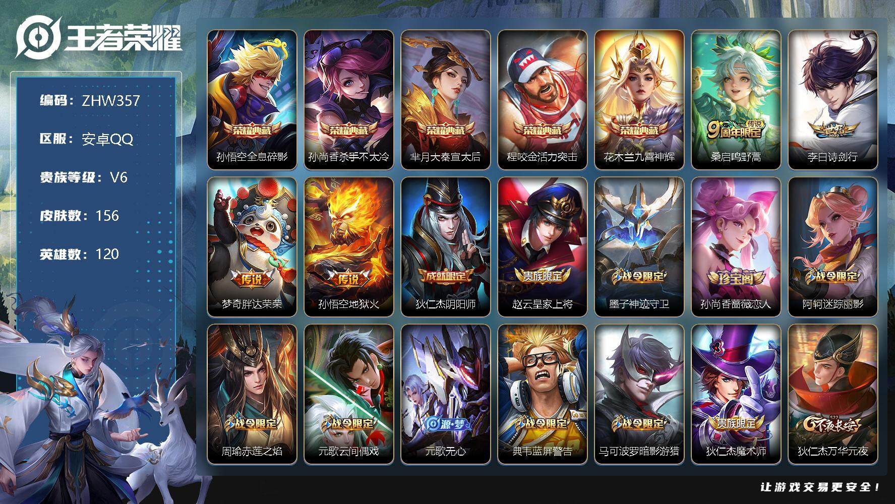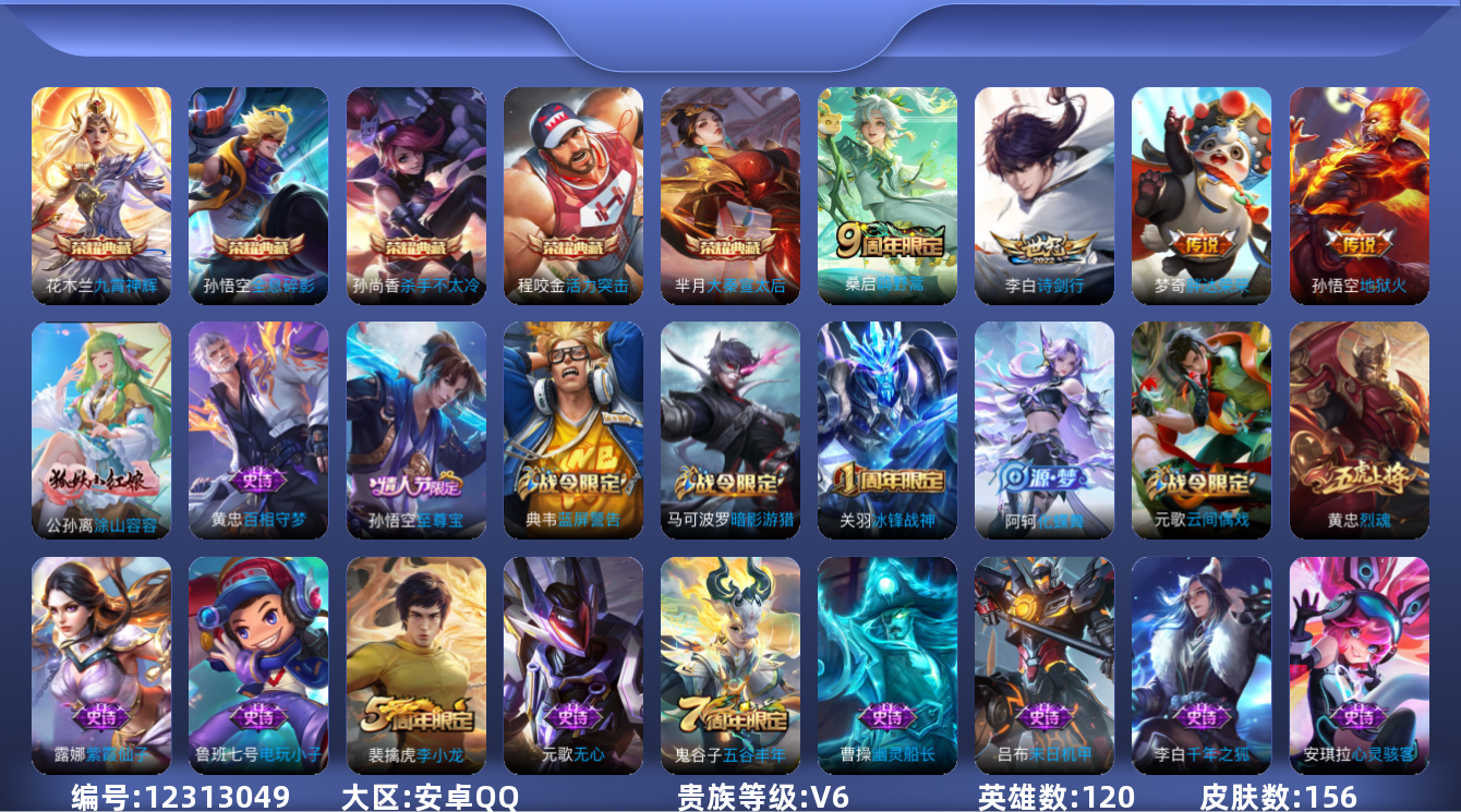 [12313049]【商品标题】:安卓Q-V6-荣耀黄金I段位-120英雄-156皮肤-5典藏-4传说-44史诗