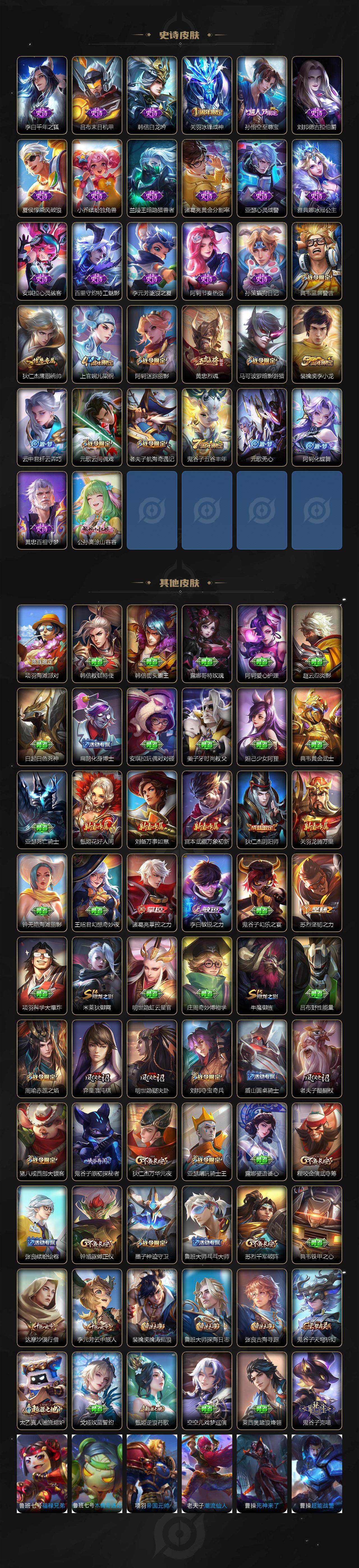 【史诗皮肤】:鲁班七号电玩小子,露娜紫霞仙子,赵云皇家上将,貂蝉圣诞恋歌,狄仁杰魔术师,宫本武藏鬼剑武藏,孙尚香蔷薇恋人,孙尚香水果甜心,妲己魅力维加斯,墨子龙骑士,吕布圣诞狂欢,曹操幽灵船长,李白千年之狐,吕布末日机甲,韩信白龙吟,关羽冰锋战神,孙悟空至尊宝,刘邦德古拉伯爵,夏侯惇乘风破浪,小乔缤纷独角兽,兰陵王暗隐猎兽者,诸葛亮黄金分割率,亚瑟心灵战警,雅典娜冰冠公主,安琪拉心灵骇客,百里守约特工魅影,李元芳逐浪之夏,阿轲节奏热浪,孙策猫狗日记,典韦蓝屏警告,狄仁杰鹰眼统帅,上官婉儿梁祝,阿轲迷踪丽影,黄忠烈魂,马可波罗暗影游猎,裴擒虎李小龙,云中君纤云弄巧,元歌云间偶戏,老夫子航海奇遇记,鬼谷子五谷丰年,元歌无心,阿轲化蝶舞,黄忠百相守梦,公孙离涂山容容