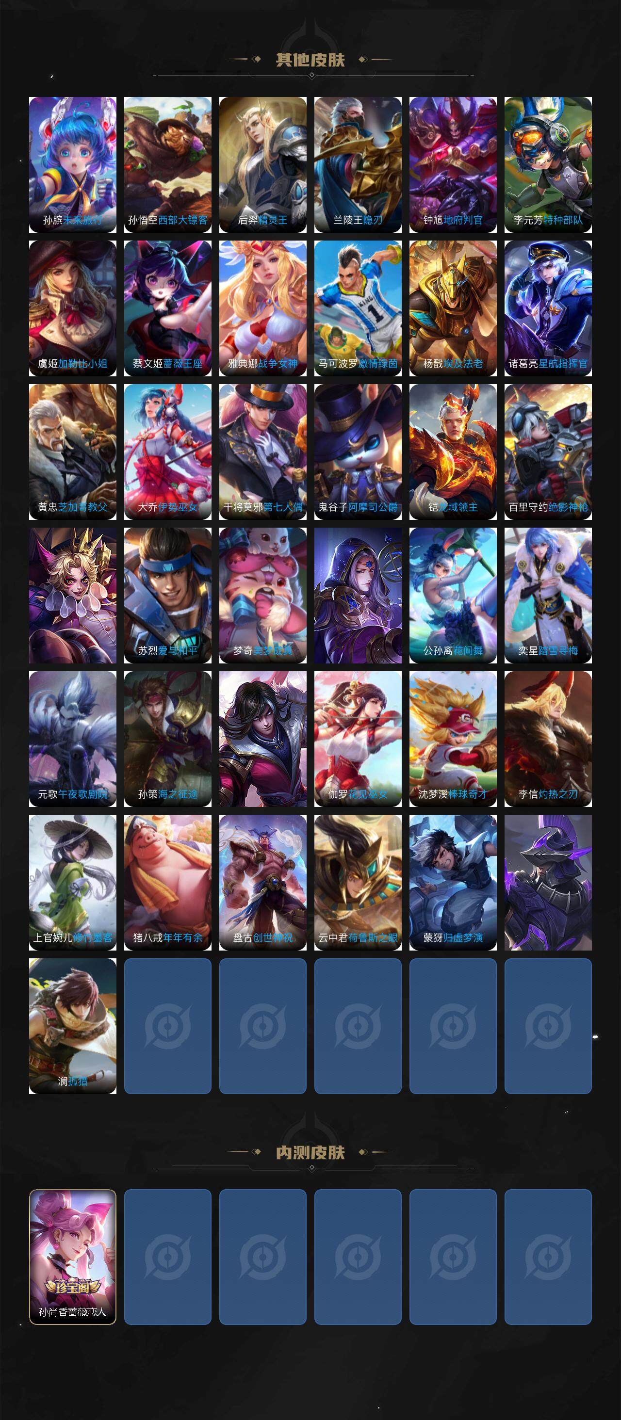 【限定皮肤】:狄仁杰阴阳师,赵云皇家上将,墨子神迹守卫,孙尚香蔷薇恋人,阿轲迷踪丽影,周瑜赤莲之焰,元歌云间偶戏,元歌无心,典韦蓝屏警告,马可波罗暗影游猎,狄仁杰魔术师,狄仁杰万华元夜,达摩沙漠行僧,项羽海滩派对,老夫子醍醐杖,老夫子航海奇遇记,关羽冰锋战神,程咬金演武夺筹,刘邦夺宝奇兵,亚瑟潮玩骑士王,孙悟空至尊宝,牛魔御旌,李元芳云中旅人,钟馗驱傩正仪,鬼谷子原初探秘者,鬼谷子五谷丰年,黄忠烈魂,苏烈千军破阵,弈星混沌棋,明世隐疑决卦,裴擒虎李小龙,裴擒虎擒涛扼浪,米莱狄御霄,云中君纤云弄巧,猪八戒西部大镖客,上官婉儿梁祝,鲁班大师探海日志,张良古海寻踪,鬼谷子天穹祈灯