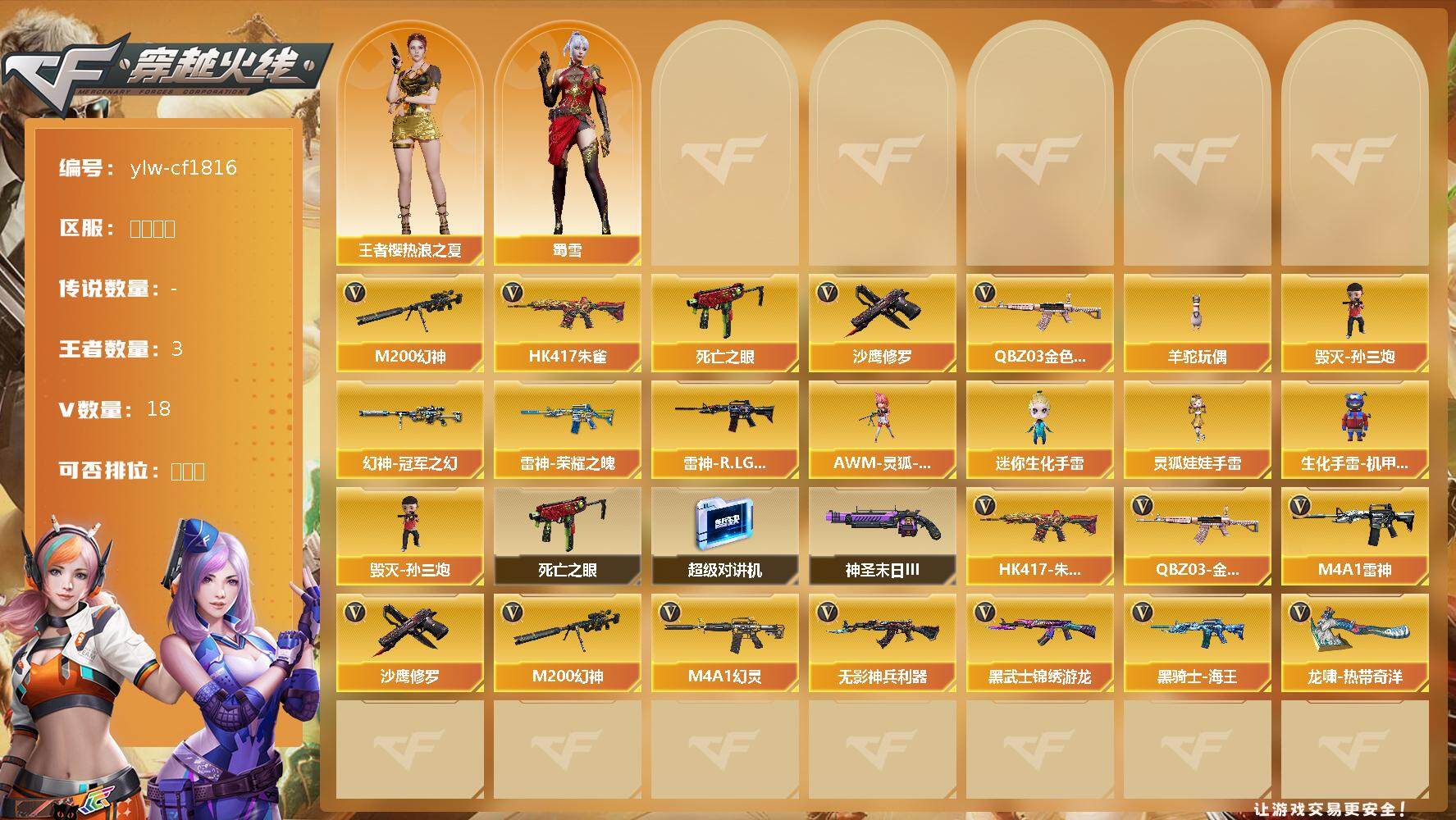 [12313216]【商品标题】:河南一区-18V-3王者-0炫金 【热门武器】:QBZ03-金色蔷薇,HK417-朱雀,M200-幻神,死亡之眼,羊驼玩偶,毁灭-孙三炮,沙鹰-修罗*3 【稀有皮肤】:幻神-冠军之幻,雷神-荣耀之魄,雷神-R.LGD-CFPLS18冠军,M200-庆典-CFS 2021 【角色】:王者樱-热浪之夏,蜀雪 【人偶武器】:毁灭-孙三炮,AWM-灵狐-15周年嘉年华,迷你生化手雷,灵狐娃娃手雷*2,生化手雷-机甲核心*2 【暴走生化】:死亡之眼,超级对讲机 【挑战大师】:神圣爆裂者-末日III 【英雄级武器】:M4A1-幻灵,QBZ03-金色蔷薇,HK417-朱雀,无影-神兵利器,M4A1-雷神,M200-幻神,黑武士-锦绣游龙,黑骑士-海王,沙鹰-修罗*3,龙啸-热带奇洋