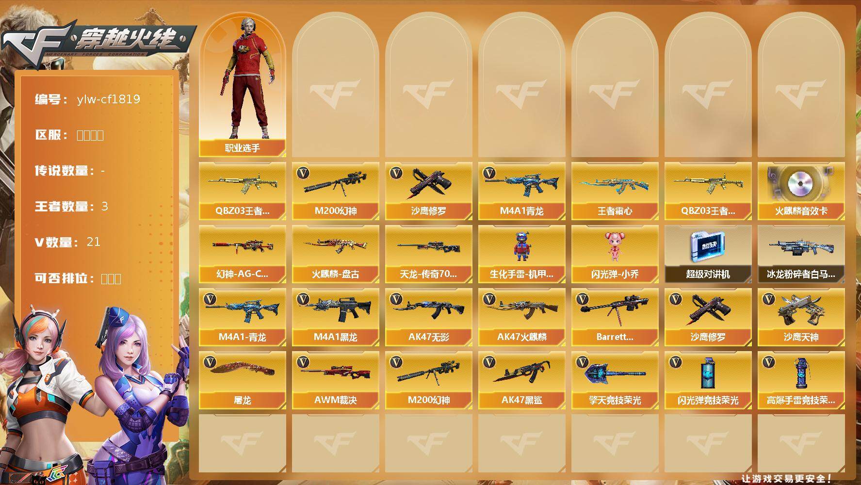 [12313343]【商品标题】:黑龙江区-21V-3王者-0炫金 【热门武器】:M4A1-青龙,M200-幻神,QBZ-03-王者蔷薇,沙鹰-修罗*2 【王者炫金武器】:QBZ-03-王者蔷薇,王者霜心 【音效卡】:AK47-火麒麟音效卡 【稀有皮肤】:幻神-AG-CFPLS17冠军,火麒麟-盘古,AWM-天龙-传奇70KG 【角色】:职业选手 【人偶武器】:生化手雷-机甲核心,闪光弹-小乔 【暴走生化】:超级对讲机 【挑战大师】:冰龙粉碎者-白马银枪 【英雄级武器】:擎天-竞技荣光,高爆手雷-竞技荣光,闪光弹-竞技荣光,M4A1-青龙,M4A1-黑龙,AK47-无影,AK47-火麒麟,Barrett-毁灭,AWM-裁决,M200-幻神,AK47-黑鲨,沙鹰-天神*3,沙鹰-修罗*2,屠龙