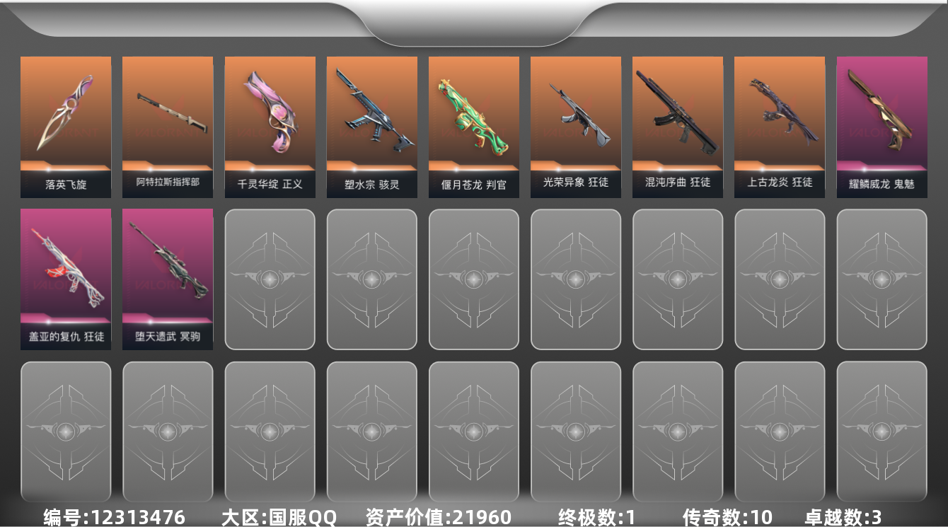 [12313476]10橙皮 1金皮 3紫皮 38皮肤 22英雄 51卡面 485已用源晶 青铜 优质装备:狂徒-混沌序曲,狂徒-盖亚的复仇,冥驹-堕天遗武,正义-千灵华绽,判官-偃月苍龙,骇灵-塑水宗,落英飞旋,阿特拉斯指挥部,鬼魅-耀鳞威龙 步枪皮肤:狂徒-上古龙炎,狂徒-光荣异象