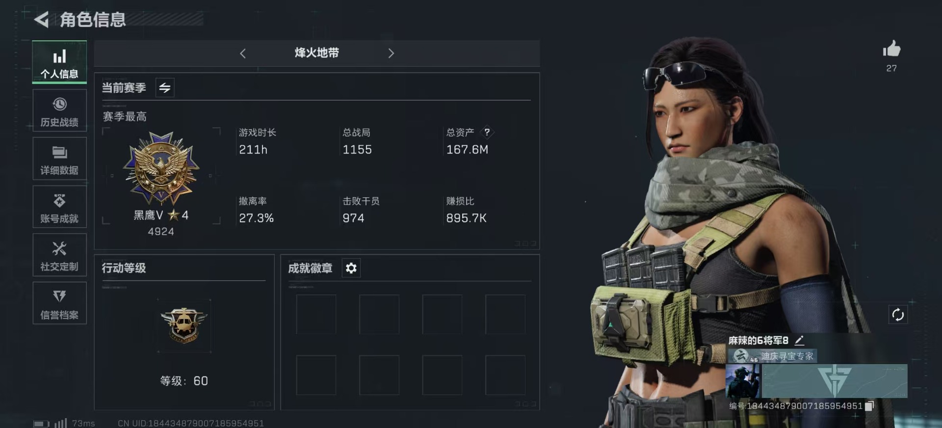 - [11608088]总资产:185.5M 1干员外观 12传说枪械 哈夫币:24.787K 可二次 可修改实名 优质装备:顶级安全箱(3x3) 烽火地带段位:钻石 全面战场段位:列兵 传说武器皮肤:M4A1突击步枪-阿米娅,CAR-15突击步枪-阿米娅,复合弓-黑-天际线,AWM狙击步枪-捞点薯条,腾龙突击步枪-捞点薯条,93R-捞点薯条,AK-12突击步枪-特斯拉线圈,SR-3M紧凑突击步枪-特斯拉线圈,UZI冲锋枪-特斯拉线圈,勇士冲锋枪-能天使-午夜邮差,725双管霰弹枪-送葬人-无题密令,M4A1突击步枪-蚀金玫瑰 史诗武器皮肤:AUG突击步枪-蝮蛇,PKM通用机枪-蝮蛇,M16A4突击步枪-竞赛选手,PKM通用机枪-荒野求生,SR-3M紧凑突击步枪-荒野求生,SV-98狙击步枪-林中猎手,SVD狙击步枪-荒野求生,M250通用机枪-囚徒,腾龙突击步枪-无垢,MP7冲锋枪-无垢,PSG-1射手步枪-无垢,QBZ95-1突击步枪-曙光 干员外观:红狼-蚀金玫瑰
