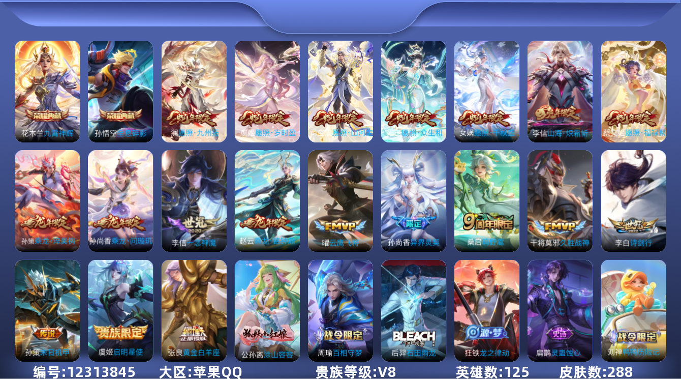 [12313845]V8 2典藏 19传说 125英雄 288皮肤 可修改实名 优质装备:全息碎影(猴子典藏),九霄神辉(木兰典藏),云鹰飞将(小将军),黄金白羊座,久胜战神,一念神魔,末日机甲-孙策,山海·炽霜斩(李信年限),涂山容容 传说皮:乘龙·问璇玑(孙尚香年限),乘龙·铭钟鼎(赵云年限),乘龙·淬吴钩(孙策年限) 珍宝阁皮:妄想食味,女武神 限定皮:愿照·九州拓(澜年限),愿照·福禄聚(蔡文姬年限),愿照·岁时盈(虞姬年限),愿照·山河定(司空震年限),愿照·众生和(妲己年限),愿照·千秋盛(女娲年限),鸣野蒿,异界灵契(白毛香),白晶晶,神威(电光马子),遇见飞天,高山流水,诗剑行,五谷丰年,逐梦之音,李小龙,逐梦之影,引擎之心 史诗皮:鸭鸭历险记-刘禅,化蝶舞,灵蛊蚀心,星界战将,龙之律动,石田雨龙,百相守梦-周瑜,茶境仙,蔬乡物语(鲁班七号),乘龙·聚宝船(安琪拉年限),乘龙·忆丹青(大乔年限),百相守梦-百里守约,紫霞仙子,黄金分割率,特工魅影,千年之狐,江河有灵,百解令(蒙犽),高渐离燃音魔法,蒙恬荣光圣徽,冰冠公主,青蛇,偶像歌手,白蛇,电玩·爆裂旋风,暗夜猫娘,百相守梦(关羽),猫狗日记-孙策,猫狗日记-大乔,时之恋人-孙尚香,乱世虎臣,节奏热浪,修罗,女仆咖啡,摇滚巨星,水果甜心,绅士熊喵,天才门将,星夜王子,心灵骇客,功夫厨神,德古拉伯爵,暗隐猎兽者,幽灵船长,鬼剑武藏,心灵战警,乐园奇幻夜,天秀·启明,舞动绿茵,地狱岩魂,拒霜思,缤纷独角兽,乘风破浪,逐浪之夏,月团寄思,水晶猎龙者,曙光守护者,箭羽风息,金属风暴,原初追逐者,圣诞狂欢,圣诞恋歌,鹰眼统帅,暗夜贵公子,魅力维加斯,黎明之约,无心,未来纪元-赵云