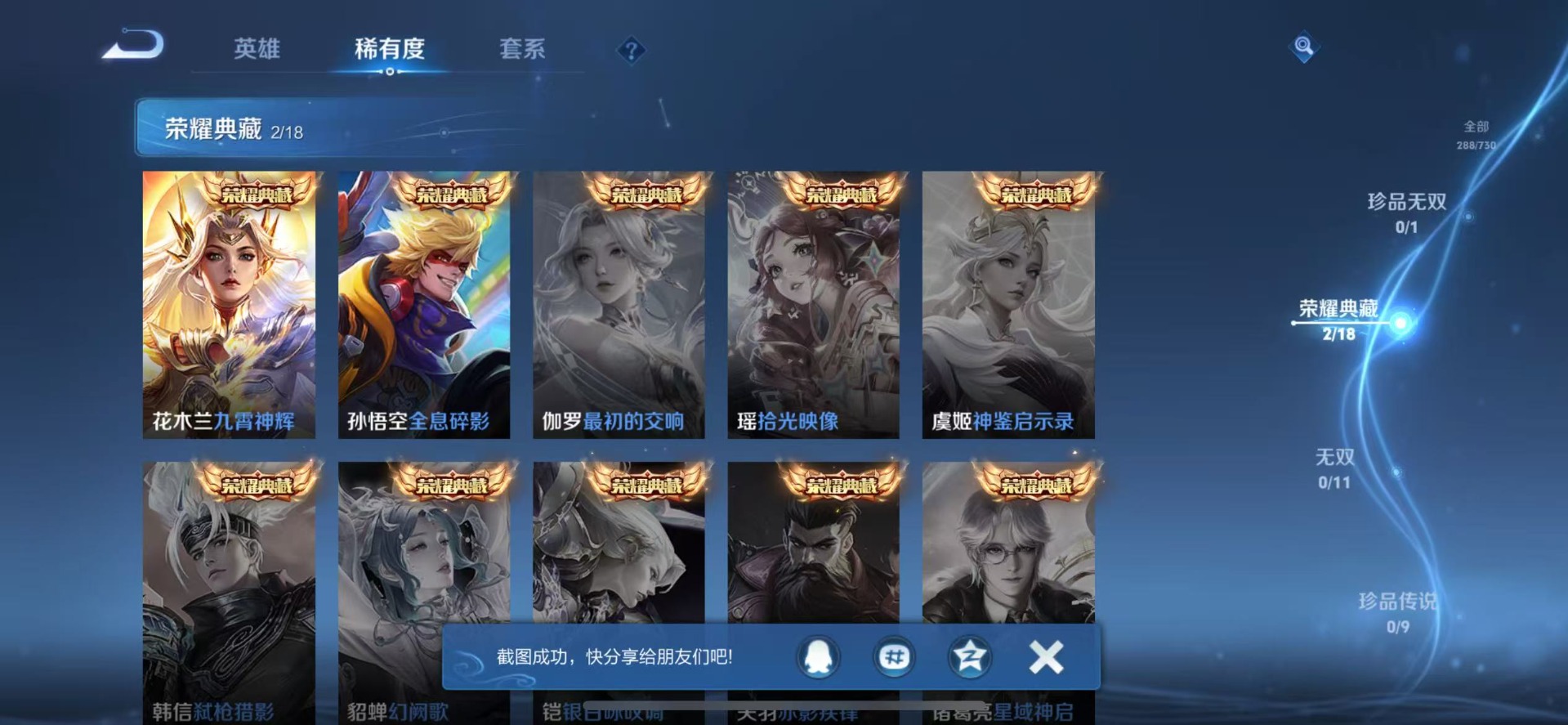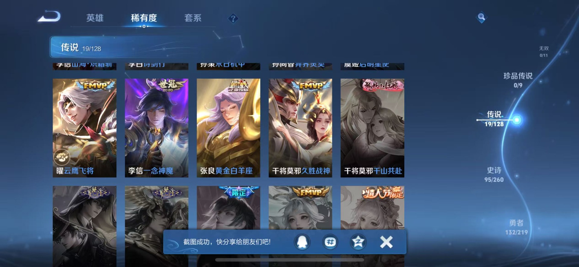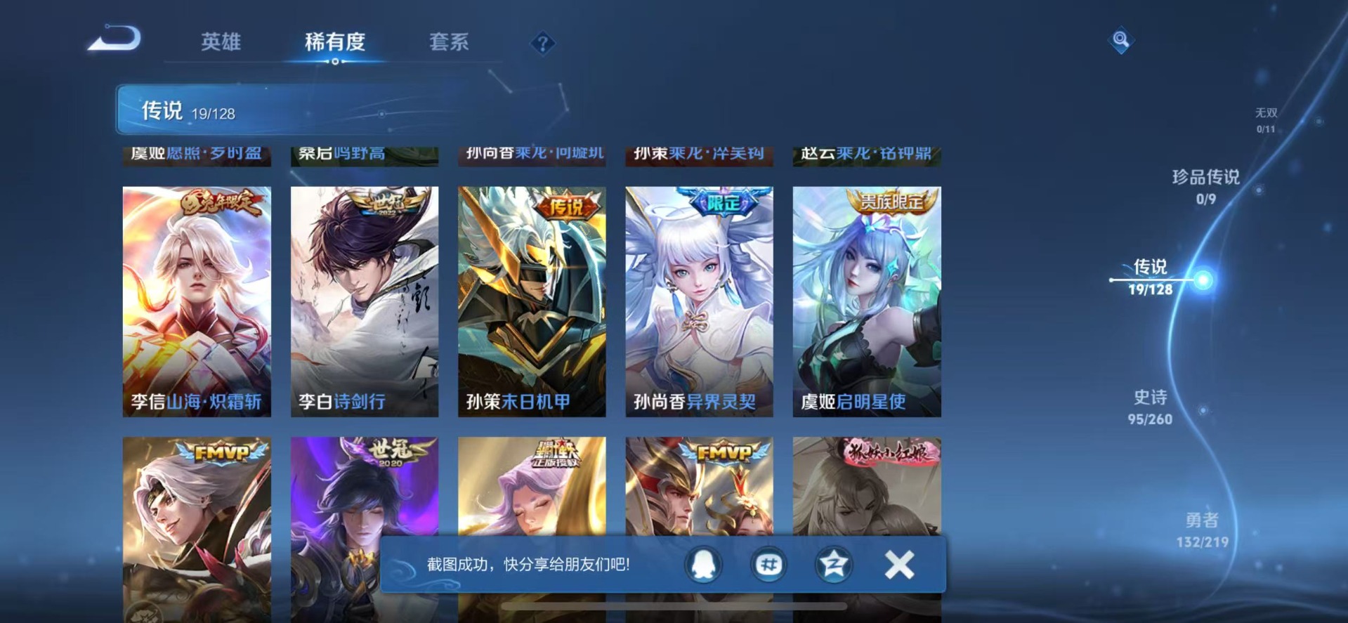 - PX_2103290-实名: 可修改 贵族等级: V6 英雄数: 124 皮肤数: 146 珍品传说: 器灵·落星盏 传说皮: 仲夏夜之梦,音你心动-小乔,貂蝉曦玄引,黄金天蝎座,幻光神枪 限定皮: 高山流水,玉兔公主,至美·乘鲤谣,鸣野蒿,愿照·众生和