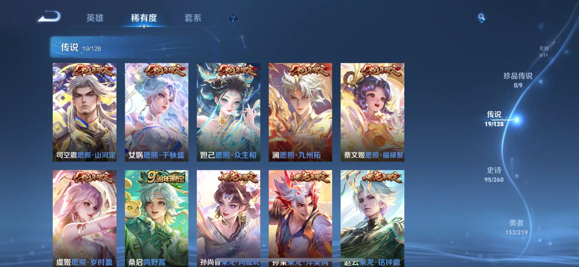孙尚香异界灵契,司空震愿照·山河定,貂蝉逐梦之音,裴擒虎李小龙,李白诗剑行,桑启鸣野蒿,女娲愿照·千秋盛,芈月白晶晶,马超神威,赵云引擎之心,妲己愿照·众生和,韩信逐梦之影,蔡文姬愿照·福禄聚,澜愿照·九州拓,虞姬愿照·岁时盈