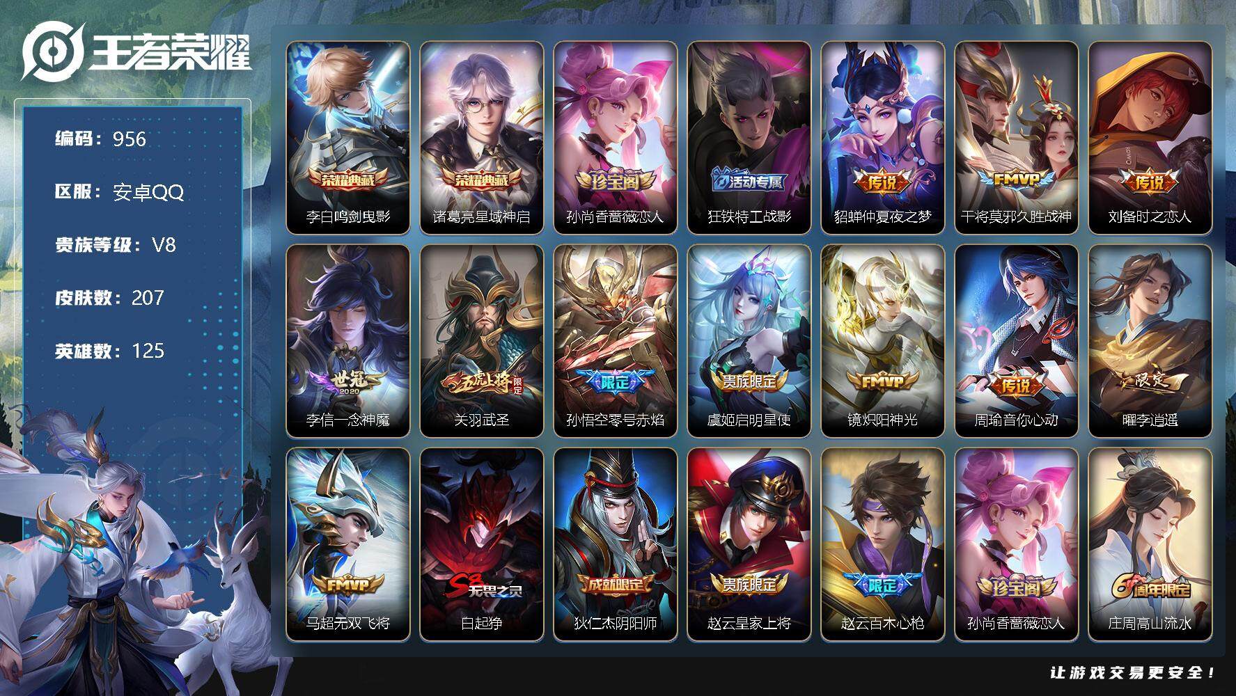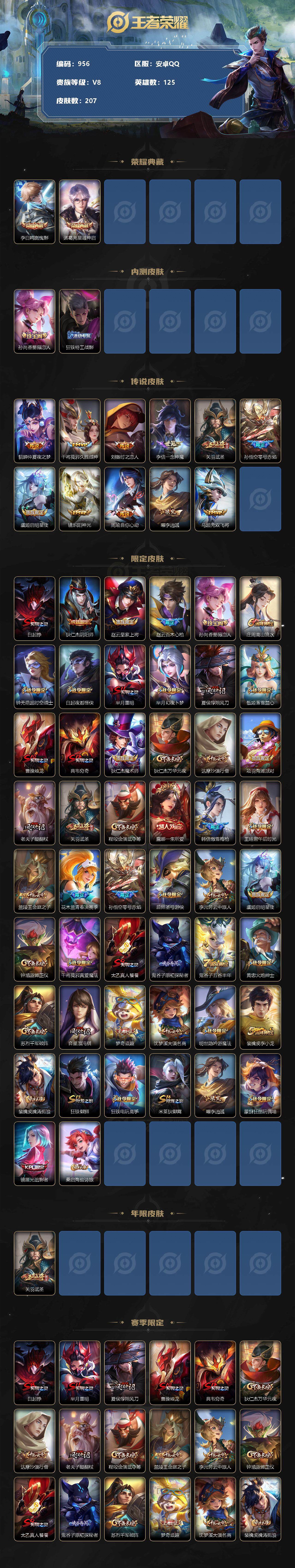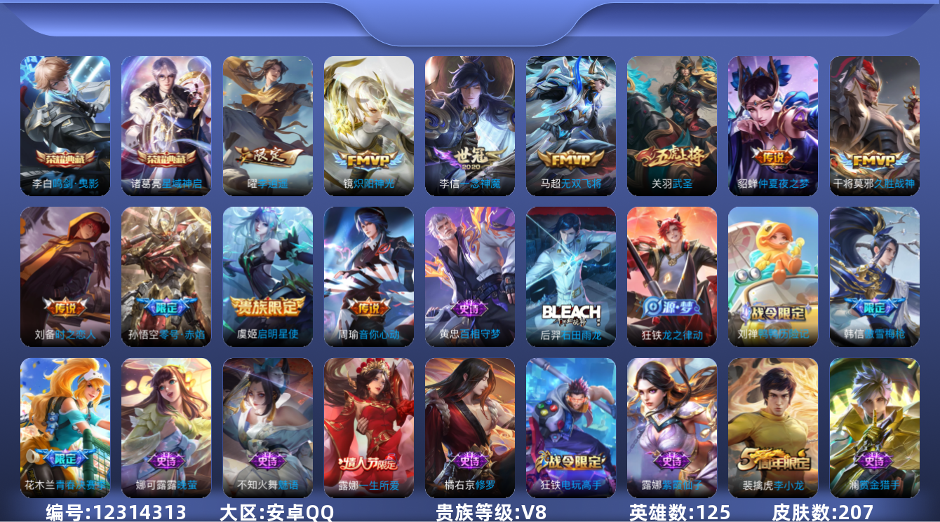 [12314313]【商品标题】:安卓Q-V8-至尊星耀I段位-125英雄-207皮肤-2典藏-0珍品无双-0无双-0珍品传说-11传说-63史诗