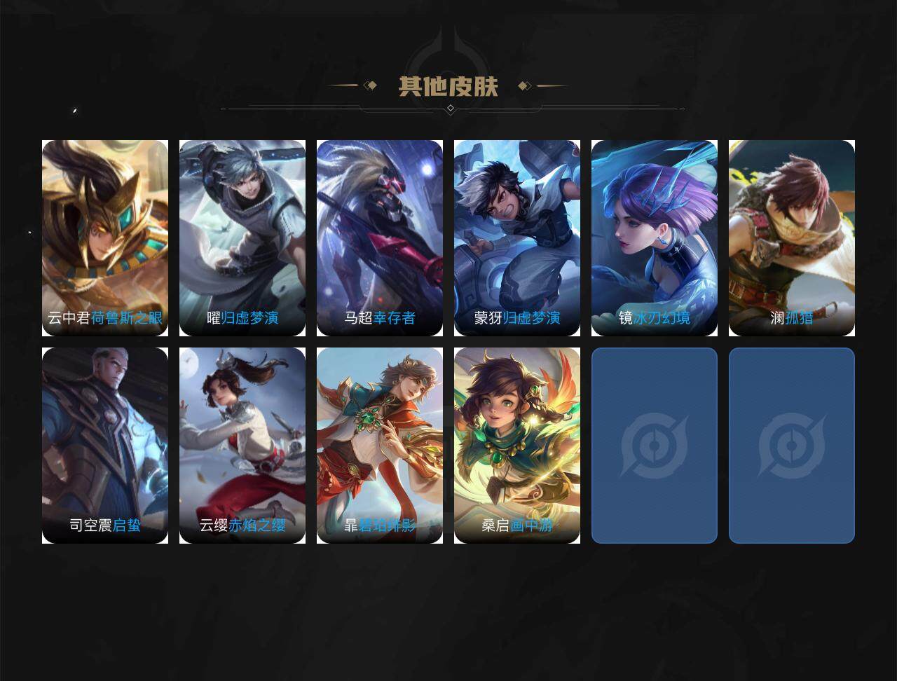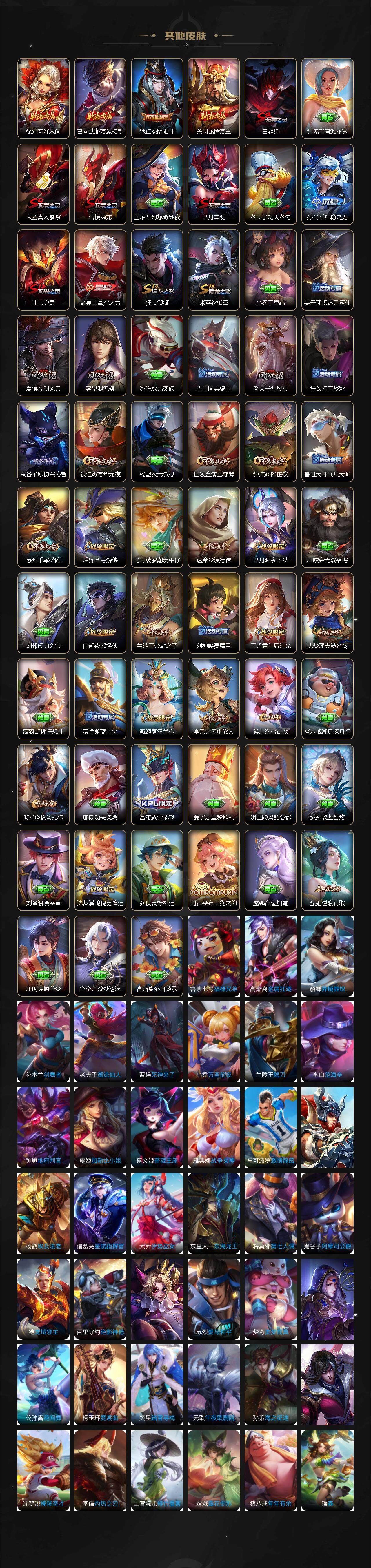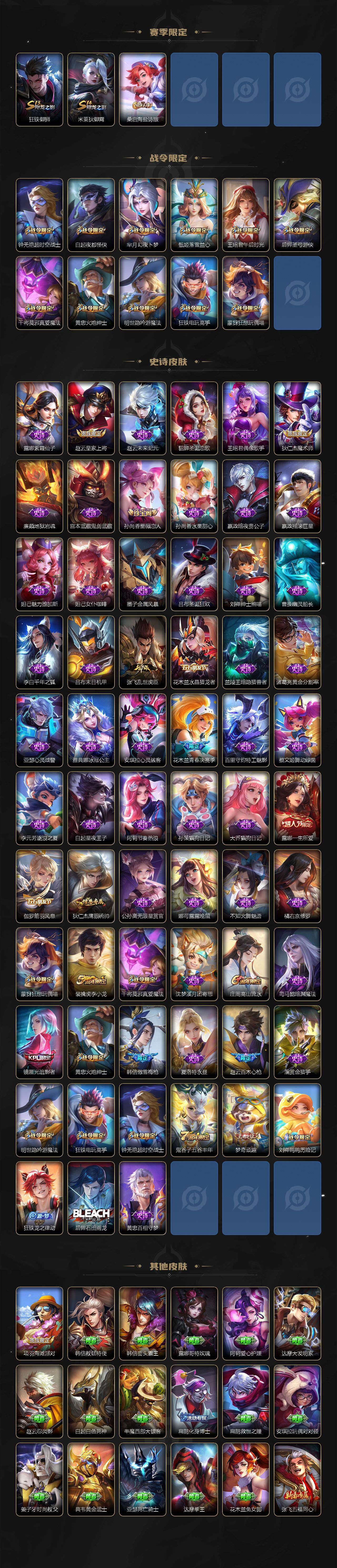 【限定皮肤】:白起狰,狄仁杰阴阳师,赵云皇家上将,赵云百木心枪,孙尚香蔷薇恋人,庄周高山流水,钟无艳超时空战士,白起夜都怪侠,芈月重明,芈月幻夜卜梦,夏侯惇朔风刀,甄姬落雪兰心,曹操烛龙,典韦穷奇,狄仁杰魔术师,狄仁杰万华元夜,达摩沙漠行僧,项羽海滩派对,老夫子醍醐杖,关羽武圣,程咬金演武夺筹,露娜一生所爱,韩信傲雪梅枪,王昭君午后时光,兰陵王金庭之子,花木兰青春决赛季,孙悟空零号赤焰,后羿圣弓游侠,李元芳云中旅人,虞姬启明星使,钟馗驱傩正仪,干将莫邪真爱魔法,太乙真人饕餮,鬼谷子原初探秘者,鬼谷子五谷丰年,黄忠火炮绅士,苏烈千军破阵,弈星混沌棋,梦奇顽趣,沈梦溪大漠名商,明世隐吟游魔法,裴擒虎李小龙,裴擒虎擒涛扼浪,狂铁御狮,狂铁电玩高手,米莱狄御霄,曜李逍遥 ,蒙犽狂想玩偶喵,镜匿光追影者,桑启海盐诗旅