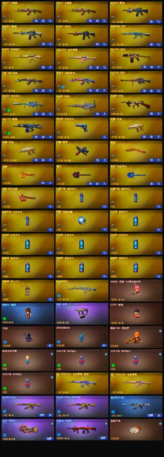 【英雄级武器】:M200-竞技荣光,柯尔特-竞技荣光,擎天-竞技荣光,高爆手雷-竞技荣光*3,烟雾弹-竞技荣光*3,闪光弹-竞技荣光*4,手雷-动感闪耀,QBZ03-金色蔷薇,无影-神兵利器,M4A1-雷神,M4A1-黑龙,M4A1-玫瑰精灵,M4A1-黑骑士,加特林-炼狱,汤姆逊-烈龙,AK47-火麒麟*2,Barrett-毁灭,AA-12-雷霆,黑武士-锦绣游龙,M4A1-赤狱骑士,沙鹰-天神*2,沙鹰-修罗,擎天,龙啸,屠龙