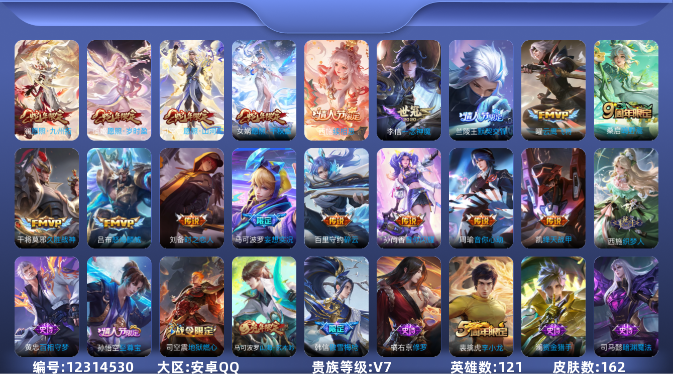 [12314530]V7 17传说 121英雄 162皮肤 可修改实名 优质装备:云鹰飞将(小将军),绛天战甲(鸡嘴战神),久胜战神,一念神魔,音你心动-周瑜,时之恋人-刘备(电焊工),音你闪耀(rap皮),碎云,妄想实况 传说皮:续相思 珍宝阁皮:胡桃夹子 限定皮:愿照·九州拓(澜年限),愿照·岁时盈(虞姬年限),愿照·山河定(司空震年限),愿照·千秋盛(女娲年限),鸣野蒿,至尊宝,傲雪梅枪,怒海麟威,李小龙,默契交锋-兰陵王,山海·玄木吟(马可年限) 史诗皮:糖绘人间,百相守梦-百里守约,百相守梦-黄忠,织梦人,白龙吟,黄金分割率,千年之狐,江河有灵,蒙恬荣光圣徽,冰冠公主,电玩·爆裂旋风,末日机甲-吕布,猫狗日记-孙策,乱世虎臣,节奏热浪,修罗,女仆咖啡,摇滚巨星,水果甜心,天才门将,心灵骇客,暗隐猎兽者,鬼剑武藏,暗渊魔法,心灵战警,水晶猎龙者,曙光守护者,热力回旋,金属风暴,圣诞狂欢,鹰眼统帅,赏金猎手