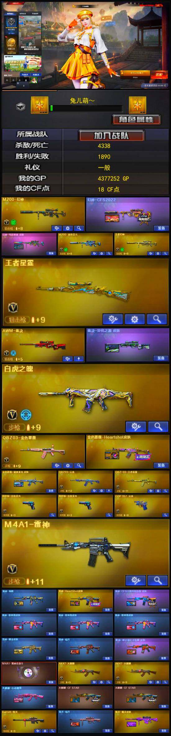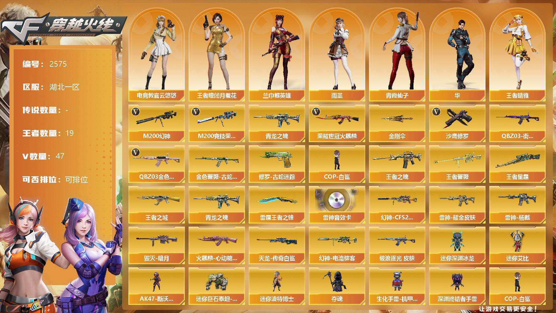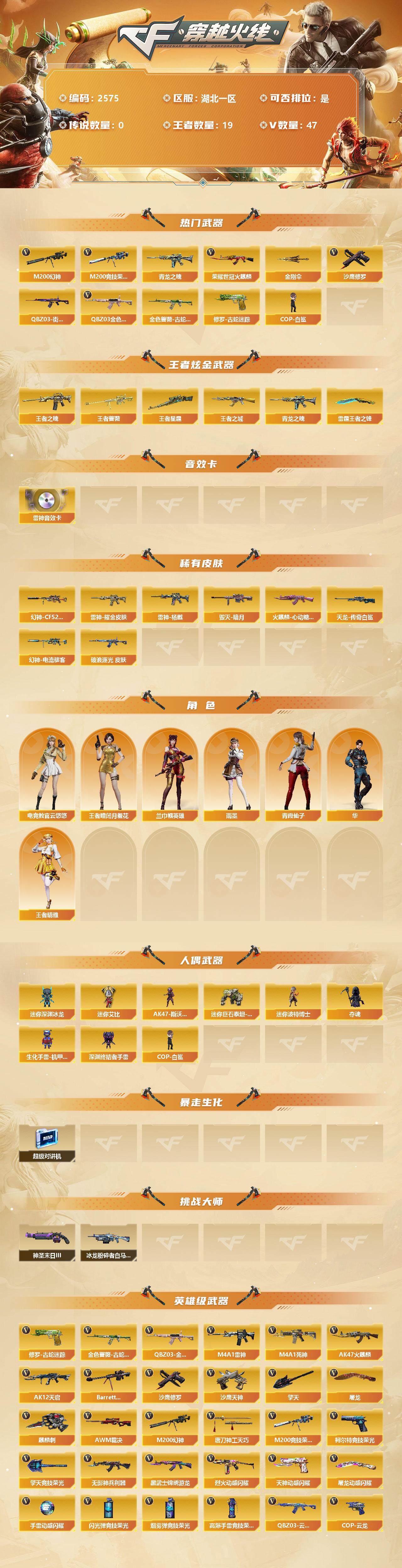 [12314590]【商品标题】:湖北一区-47V-19王者-0炫金 【热门武器】:QBZ03-金色蔷薇,M200-幻神,金色蔷薇-古蛇迷踪,修罗-古蛇迷踪,M200-竞技荣光,青龙之魄,荣耀世冠-火麒麟,QBZ03-街机,COP-白鲨,沙鹰-修罗,金刚伞 【王者炫金武器】:王者之城,王者之魄,王者蔷薇,王者星霆,青龙之魄,雷霆王者之锋 【音效卡】:M4A1-雷神音效卡 【稀有皮肤】:幻神-CFS2022,幻神-电流骇客 皮肤,金色蔷薇-破浪逐光 皮肤,雷神-耀金皮肤,雷神-杨戬,火麒麟-心动糖果,毁灭-暗月,AWM-天龙-传奇白鲨 【角色】:王者-瞳-闭月羞花,王者晴雅,电竞教官-云悠悠,兰-巾帼英雄,雨墨,华,青霞仙子 【人偶武器】:COP-白鲨,AK47-斯沃特,迷你深渊冰龙,迷你艾比,迷你巨石泰坦-魔花研究所,迷你波特博士,夺魂,生化手雷-机甲核心,深渊终结者手雷*2 【暴走生化】:超级对讲机 【挑战大师】:神圣爆裂者-末日III,冰龙粉碎者-白马银枪 【英雄级武器】:QBZ03-云龙,COP 357-云龙,唐刀-神工天巧,M200-竞技荣光,柯尔特-竞技荣光*2,擎天-竞技荣光,高爆手雷-竞技荣光,烟雾弹-竞技荣光*2,闪光弹-竞技荣光,荣耀世冠-火麒麟,烈火-动感闪耀,天神-动感闪耀,屠龙-动感闪耀,手雷-动感闪耀,QBZ03-金色蔷薇,金色蔷薇-古蛇迷踪,无影-神兵利器,M4A1-雷神,M4A1-死神,AK47-火麒麟*2,AK12-天启,Barrett-毁灭,AWM-裁决,M200-幻神,黑武士-锦绣游龙,修罗-古蛇迷踪,沙鹰-天神*4,沙鹰-修罗,麒麟刺,擎天,屠龙*3 【特殊枪械】: