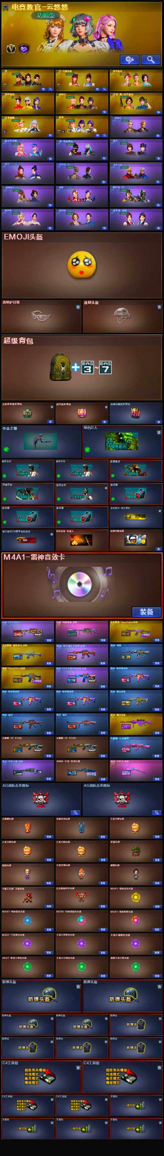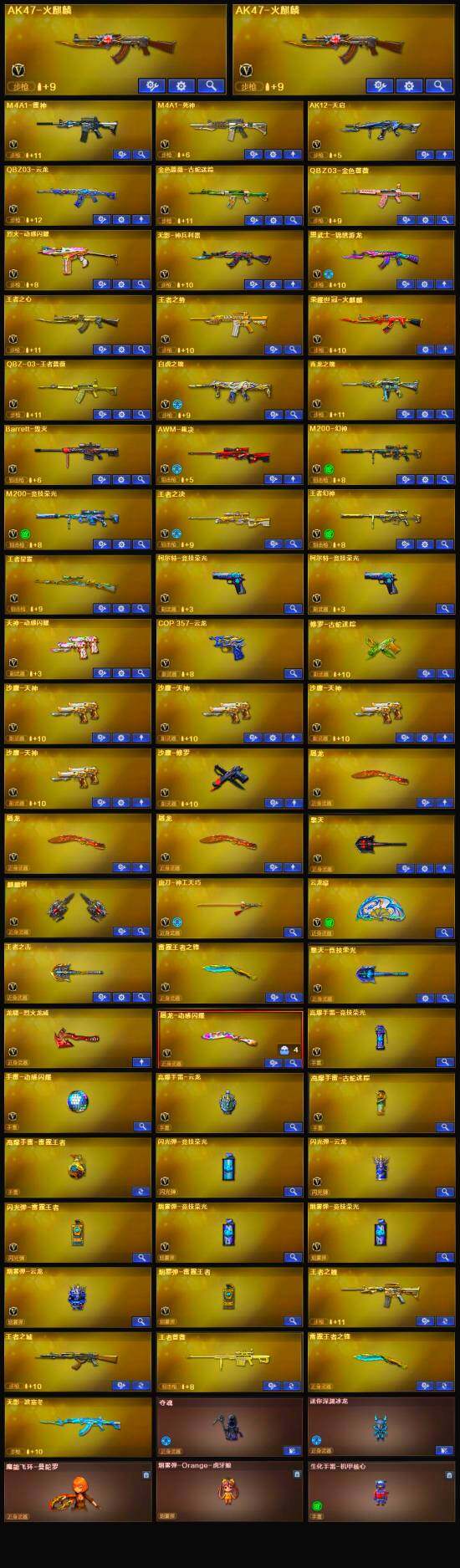 【英雄级武器】:QBZ03-云龙,COP 357-云龙,唐刀-神工天巧,M200-竞技荣光,柯尔特-竞技荣光*2,擎天-竞技荣光,高爆手雷-竞技荣光,烟雾弹-竞技荣光*2,闪光弹-竞技荣光,荣耀世冠-火麒麟,烈火-动感闪耀,天神-动感闪耀,屠龙-动感闪耀,手雷-动感闪耀,QBZ03-金色蔷薇,金色蔷薇-古蛇迷踪,无影-神兵利器,M4A1-雷神,M4A1-死神,AK47-火麒麟*2,AK12-天启,Barrett-毁灭,AWM-裁决,M200-幻神,黑武士-锦绣游龙,修罗-古蛇迷踪,沙鹰-天神*4,沙鹰-修罗,麒麟刺,擎天,屠龙*3
