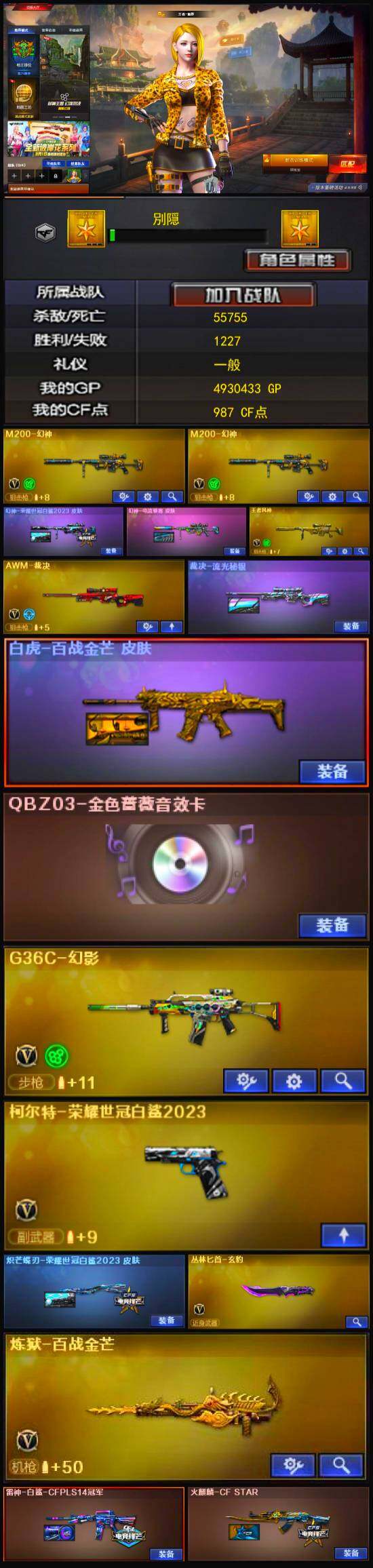 - [10312973]【商品标题】:黑龙江区-36V-2王者-0炫金 【热门武器】:M200-幻神,金色蔷薇-古蛇迷踪,修罗-古蛇迷踪,M200-竞技荣光,白虎-电玩蓝兔,USP-雷暴,COP 357-幻灵,沙鹰-修罗 【稀有皮肤】:幻神-CFS2022,幻神-AG-CFPL S24冠军 皮肤,火麒麟-心动糖果 【角色】:王者零-华冠丽服,零-水下丽影,铁骑荣耀 【人偶武器】:Scar Light-马枪,迷你深渊冰龙,迷你艾比,迷你超能女侍,夺魂,生化手雷-机甲核心*2 【挑战大师】:神圣爆裂者-末日III,激光毁灭者III,冰龙粉碎者-白马银枪 【英雄级武器】:M200-竞技荣光,擎天-竞技荣光,高爆手雷-竞技荣光*2,烟雾弹-竞技荣光*2,闪光弹-竞技荣光*2,COP 357-幻灵,幻灵之锋,USP-雷暴,烈火-动感闪耀,天神-动感闪耀,屠龙-动感闪耀,手雷-动感闪耀,金色蔷薇-古蛇迷踪,白虎-电玩蓝兔,无影-神兵利器,M4A1-雷神,AK47-火麒麟,M200-幻神,AK47-黑鲨,M4A1-赤狱骑士,修罗-古蛇迷踪,沙鹰-天神*2,沙鹰-修罗,擎天 【特殊枪械】:0白虎,0黑骑士,0烈龙,0盘龙,0炼狱,0蝴蝶斯泰尔