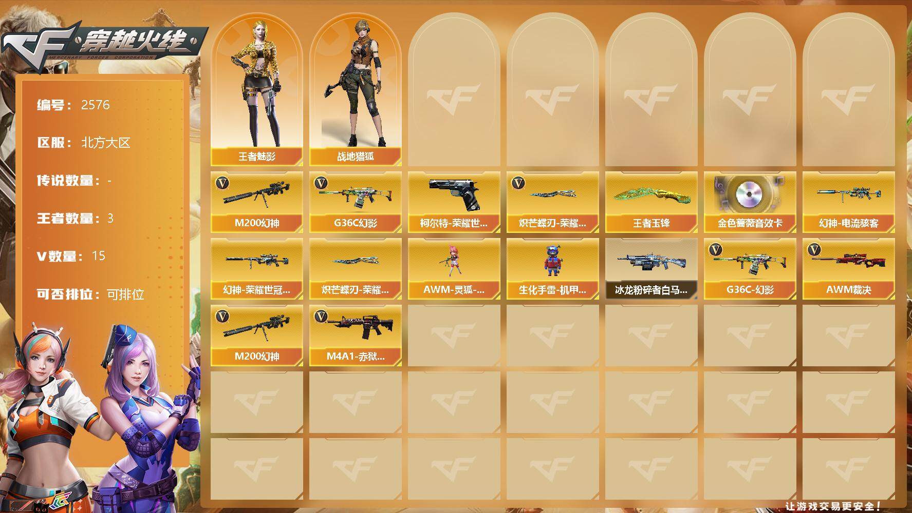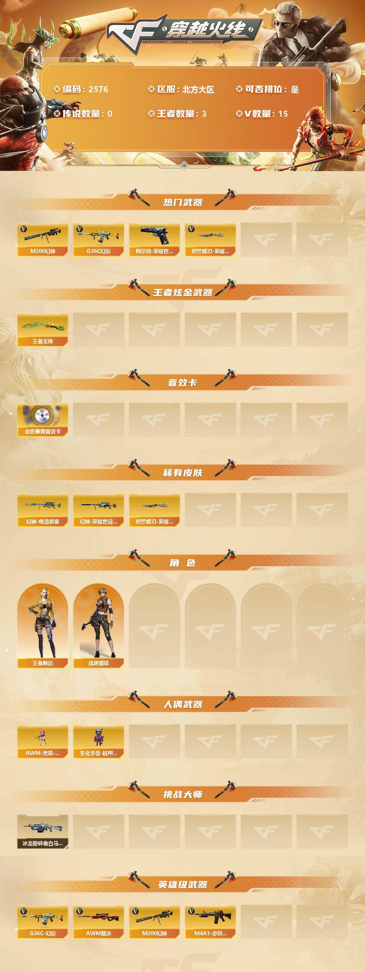 [12314685]【商品标题】:北方大区-15V-3王者-0炫金 【热门武器】:G36C-幻影,M200-幻神*2,柯尔特-荣耀世冠白鲨2023,炽芒蝶刃-荣耀世冠白鲨2023 皮肤 【王者炫金武器】:王者玉锋 【音效卡】:QBZ03-金色蔷薇音效卡 【稀有皮肤】:幻神-电流骇客 皮肤,幻神-荣耀世冠白鲨2023 皮肤,炽芒蝶刃-荣耀世冠白鲨2023 皮肤 【角色】:王者-魅影,战地猎狐 【人偶武器】:AWM-灵狐-15周年嘉年华,生化手雷-机甲核心 【挑战大师】:冰龙粉碎者-白马银枪 【英雄级武器】:G36C-幻影,AWM-裁决,M200-幻神*2,M4A1-赤狱骑士 【特殊枪械】:
