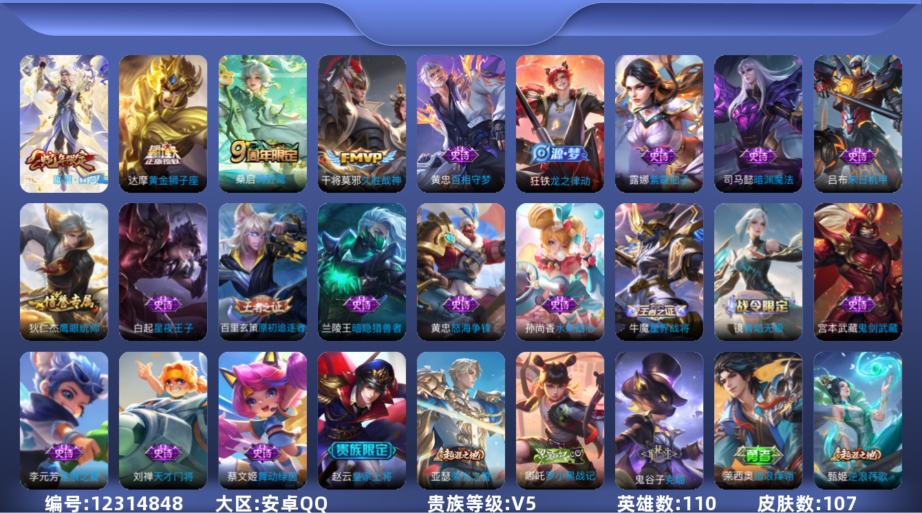 [12314848]V5 4传说 110英雄 107皮肤 可修改实名 优质装备:黄金狮子座,久胜战神 限定皮:愿照·山河定(司空震年限),鸣野蒿 史诗皮:龙之律动,怒海争锋,百相守梦-黄忠,星界战将,紫霞仙子,末日机甲-吕布,水果甜心,天才门将,星夜王子,暗隐猎兽者,鬼剑武藏,暗渊魔法,舞动绿茵,逐浪之夏,原初追逐者,鹰眼统帅