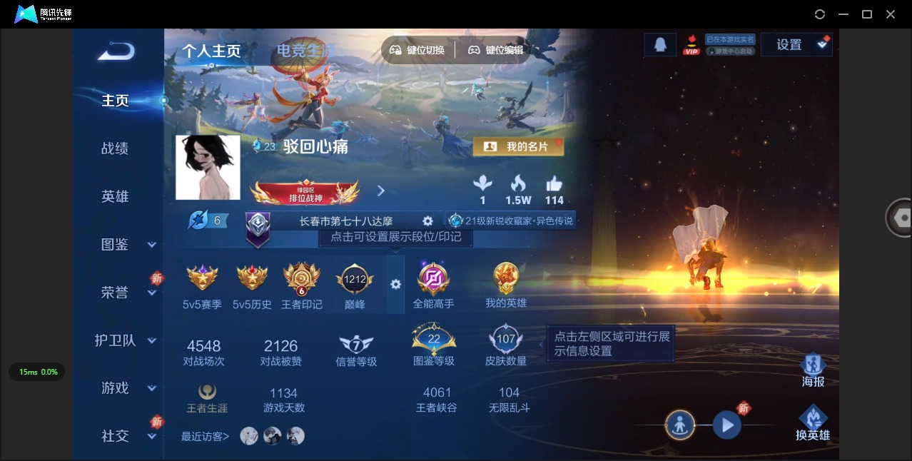 - PX_2093858-实名: 可修改 贵族等级: V7 英雄数: 104 皮肤数: 101 荣耀水晶: 最初的交响 无双皮: 雪境奇遇-甄姬 珍品传说: 江户川柯南,怪盗基德 传说皮: 绛天战甲,幻光神枪 限定皮: 引擎之心,鸣野蒿,愿照·山河定