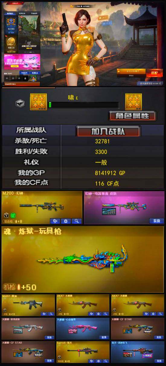 - [12308364]【商品标题】:河南一区-50V-10王者-4炫金 【热门武器】:QBZ03-金色蔷薇,M200-幻神,M4A1-黑骑士,汤姆逊-烈龙*2,加特林-炼狱,沙鹰-修罗*3 【王者炫金武器】:炫金黑龙,炫金雷神*2,炫金修罗,炼狱-悦蓝*2,王者之影,王者之怒,王者之魂 【音效卡】:M200-幻神音效卡,AK47-火麒麟音效卡,M4A1-黑骑士音效卡,Barrett-毁灭音效卡 【稀有皮肤】:幻神-周瑜皮肤,雷神-能量核心,雷神-星空,雷神-耀金皮肤,火麒麟-平天大圣,黑骑士-暗月*2,毁灭-星空,天龙-秘银,天龙-能量核心,天神-暗月*2 【角色】:王者之瞳,王者玲珑-小乔,零-水下丽影,樱 【人偶武器】:闪光弹-小乔,闪光弹-貂蝉,高爆手雷-大乔 【暴走生化】:超级对讲机 【英雄级武器】:M4A1-武圣,Glock18-武圣,QBZ03-金色蔷薇,M4A1-雷神*3,M4A1-黑龙,M4A1-玫瑰精灵,M4A1-黑骑士,M4A1-死神,加特林-炼狱,汤姆逊-烈龙*2,AK47-无影,AK47-火麒麟,AWM-天龙,Barrett-毁灭*2,Barrett-极光,M200-幻神,AK47-黑鲨,M4A1-千变,黑武士-锦绣游龙,AK-47-猩红传说*3,AK47-B-战神,AK47-B-常胜将军,M4A1-赤狱骑士,沙鹰-天神,沙鹰-修罗*3,麒麟刺,擎天,龙啸,屠龙*3 【特殊枪械】:1黑骑士,2烈龙,1炼狱