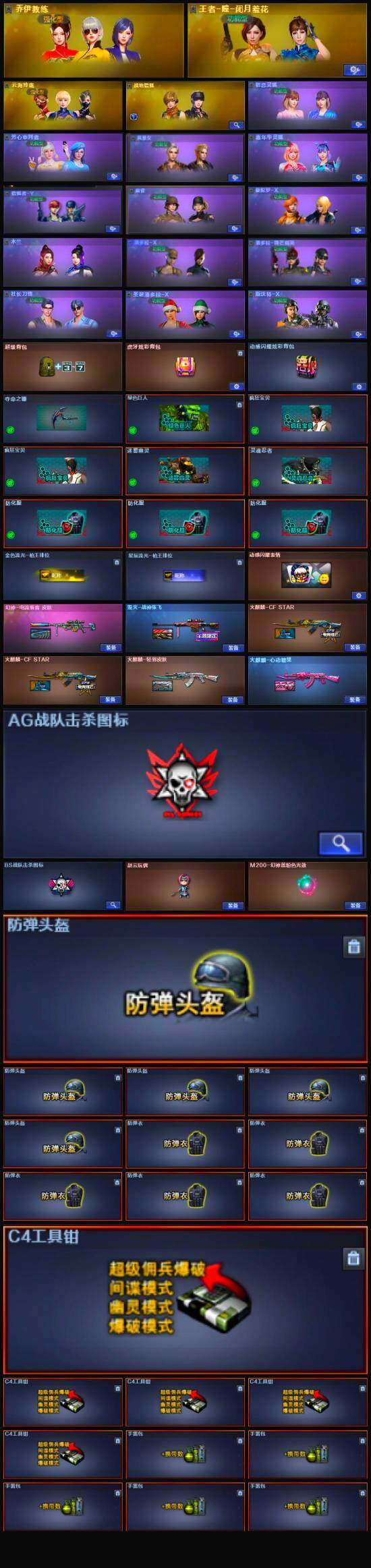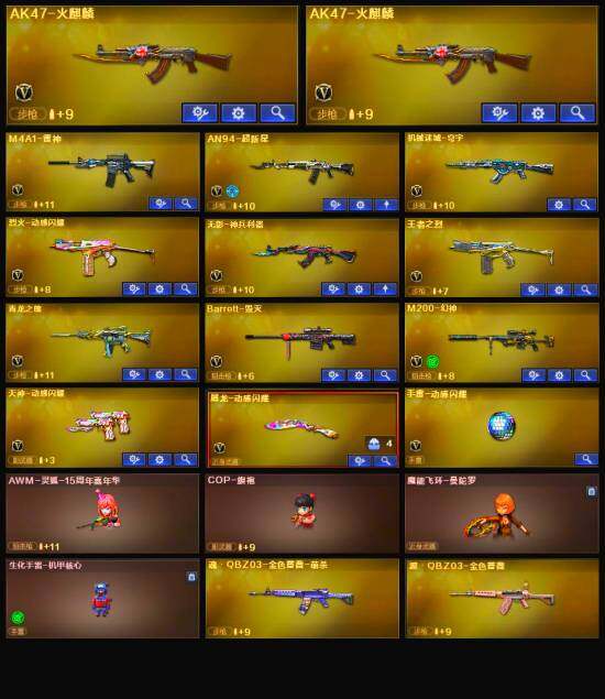 【英雄级武器】:烈火-动感闪耀,天神-动感闪耀,屠龙-动感闪耀,手雷-动感闪耀,无影-神兵利器,M4A1-雷神,AK47-火麒麟*2,AN94-超新星,Barrett-毁灭,M200-幻神,M4A1-赤狱骑士