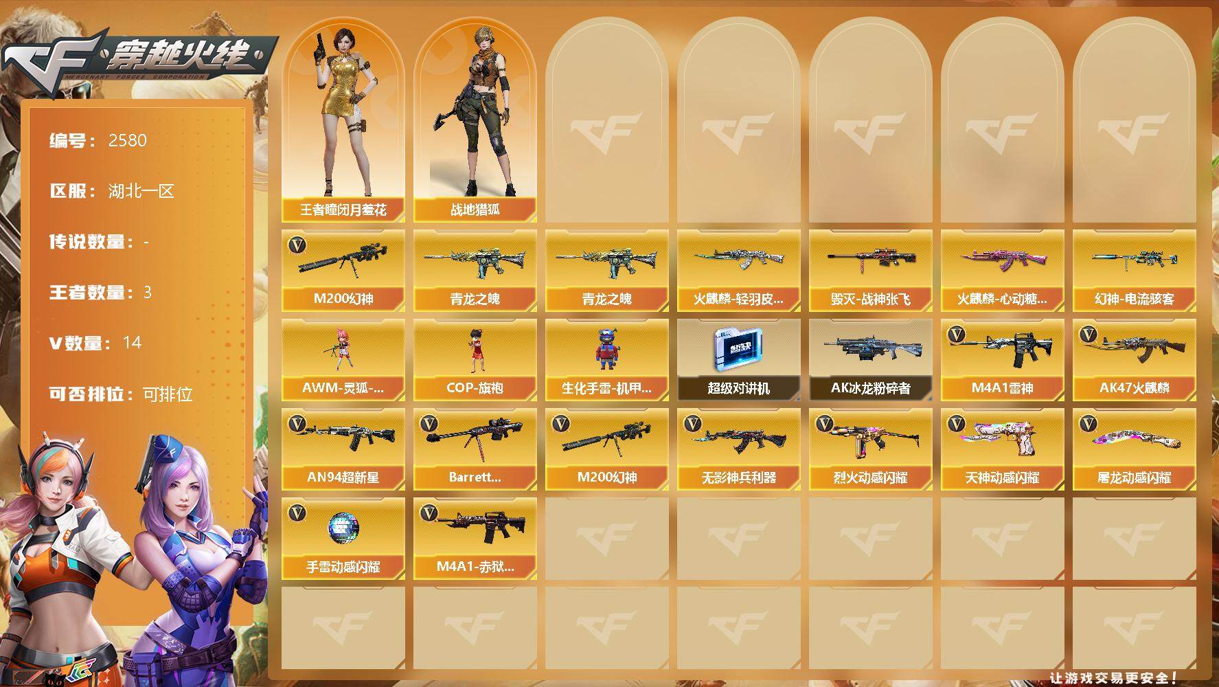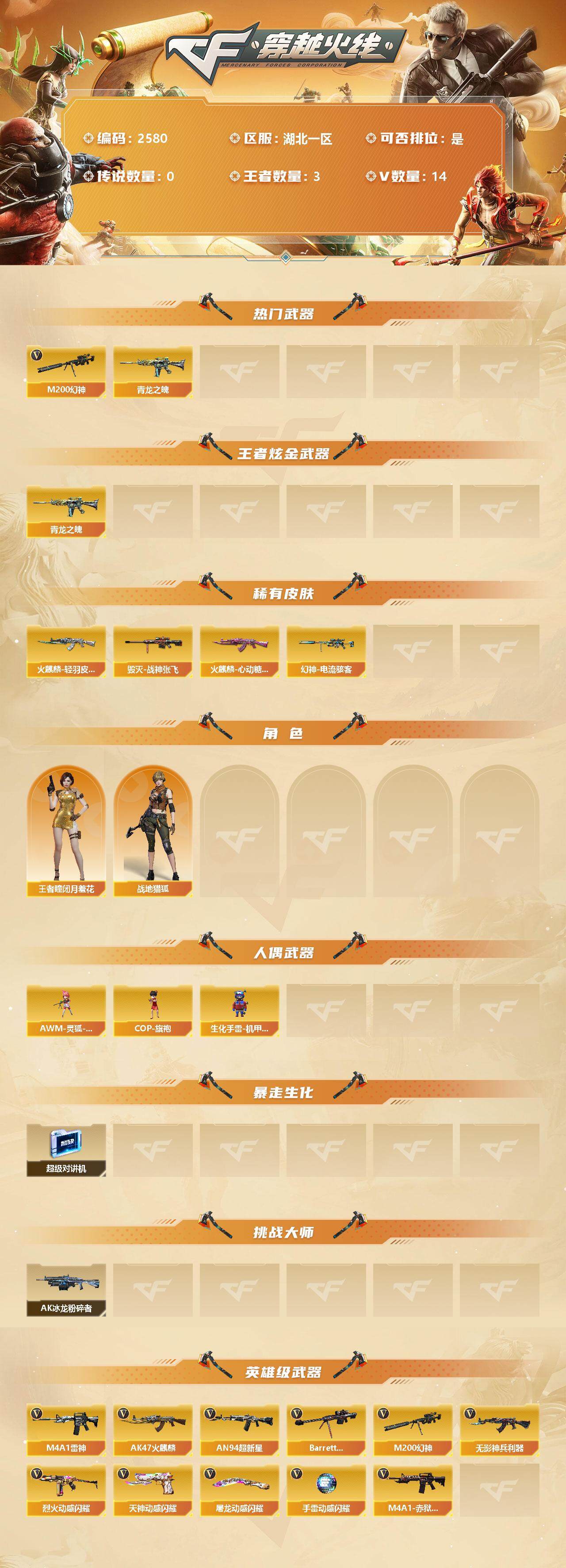[12314936]【商品标题】:湖北一区-14V-3王者-0炫金 【热门武器】:M200-幻神,青龙之魄 【王者炫金武器】:青龙之魄 【稀有皮肤】:幻神-电流骇客 皮肤,火麒麟-轻羽皮肤,火麒麟-心动糖果,毁灭-战神张飞 【角色】:王者-瞳-闭月羞花,战地猎狐 【人偶武器】:AWM-灵狐-15周年嘉年华,COP-旗袍,生化手雷-机甲核心 【暴走生化】:超级对讲机 【挑战大师】:AK47-冰龙粉碎者 【英雄级武器】:烈火-动感闪耀,天神-动感闪耀,屠龙-动感闪耀,手雷-动感闪耀,无影-神兵利器,M4A1-雷神,AK47-火麒麟*2,AN94-超新星,Barrett-毁灭,M200-幻神,M4A1-赤狱骑士 【特殊枪械】: