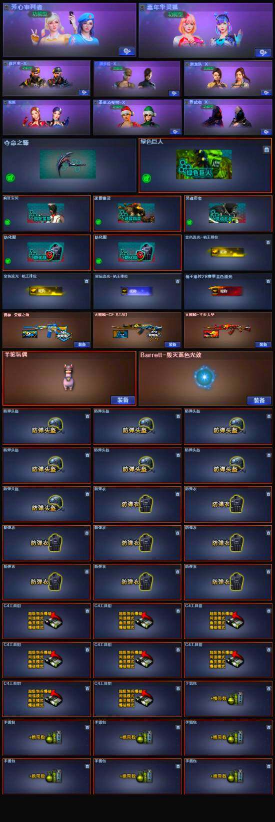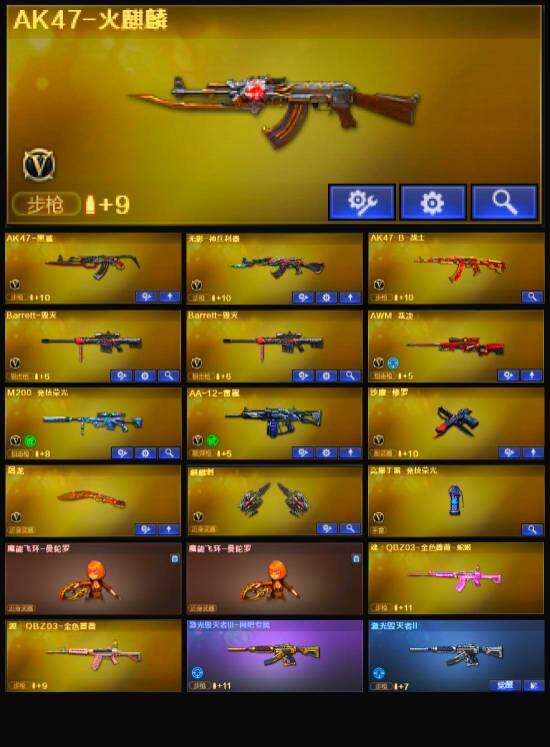 【英雄级武器】:M200-竞技荣光,高爆手雷-竞技荣光,无影-神兵利器,AK47-火麒麟,Barrett-毁灭*2,AWM-裁决,AA-12-雷霆,AK47-黑鲨,AK-47-猩红传说,M4A1-赤狱骑士,沙鹰-修罗,麒麟刺,屠龙