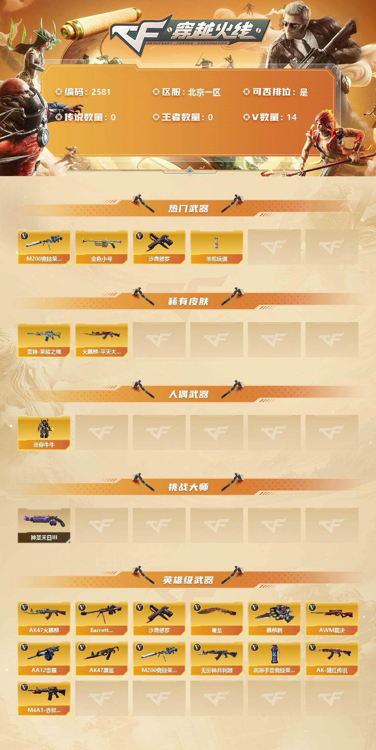 [12314993]【商品标题】:北京一区-14V-0王者-0炫金 【热门武器】:M200-竞技荣光,金色小号,羊驼玩偶,沙鹰-修罗 【稀有皮肤】:雷神-荣耀之魄,火麒麟-平天大圣 【人偶武器】:迷你牛牛 【挑战大师】:神圣爆裂者-末日III 【英雄级武器】:M200-竞技荣光,高爆手雷-竞技荣光,无影-神兵利器,AK47-火麒麟,Barrett-毁灭*2,AWM-裁决,AA-12-雷霆,AK47-黑鲨,AK-47-猩红传说,M4A1-赤狱骑士,沙鹰-修罗,麒麟刺,屠龙 【特殊枪械】:
