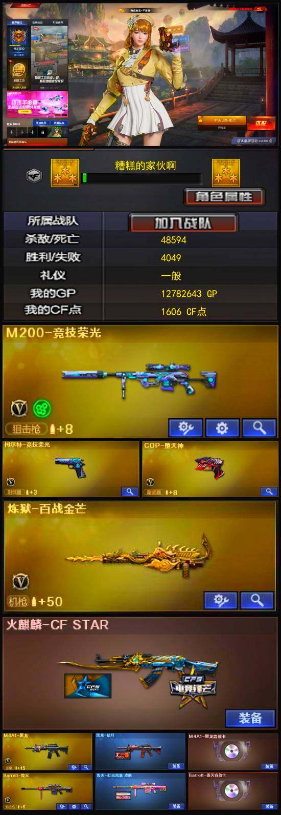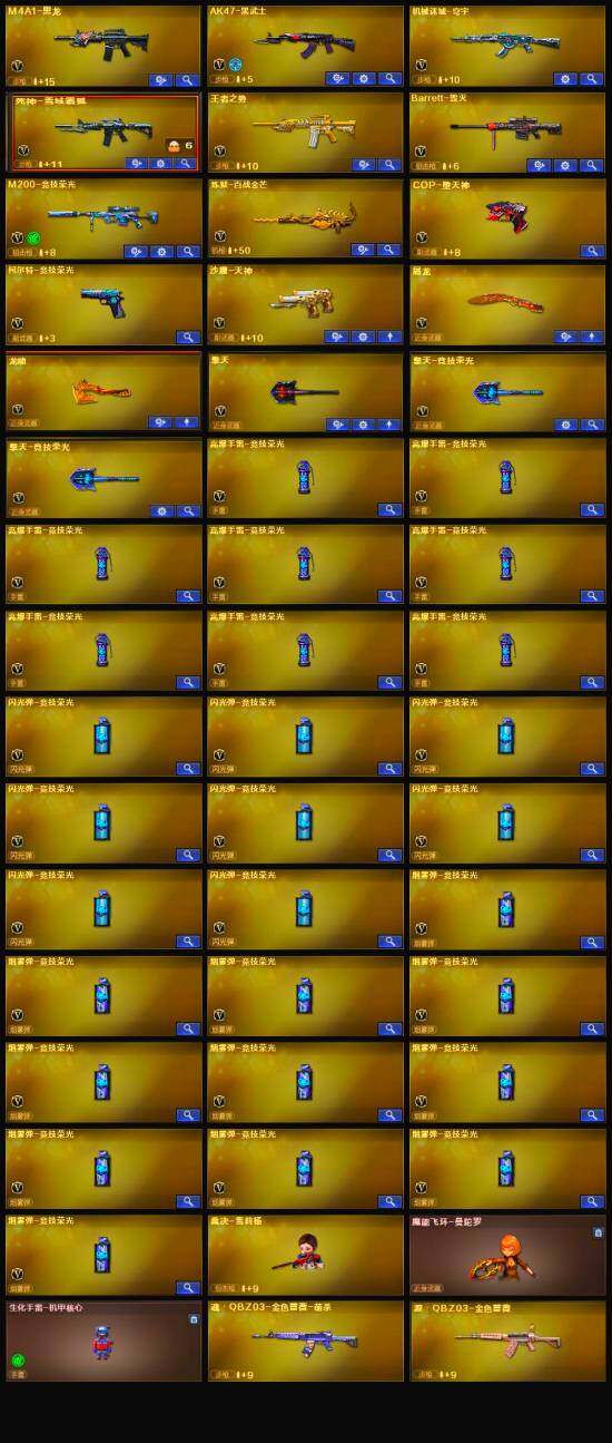 【英雄级武器】:M200-竞技荣光,柯尔特-竞技荣光,擎天-竞技荣光*2,高爆手雷-竞技荣光*8,烟雾弹-竞技荣光*11,闪光弹-竞技荣光*8,COP-堕天神,M4A1-黑龙,AK47-黑武士,Barrett-毁灭,死神-雪域霜狐,AWM-昌龙,M4A1-赤狱骑士,沙鹰-天神,擎天,龙啸,屠龙