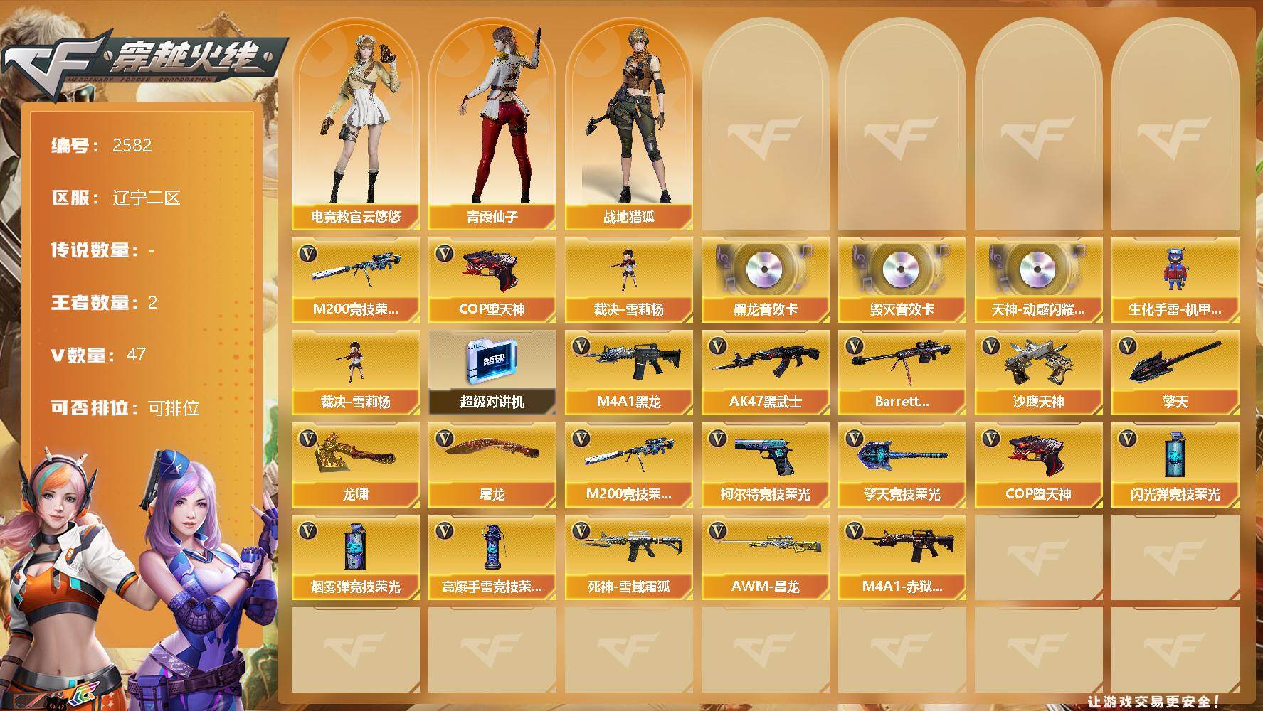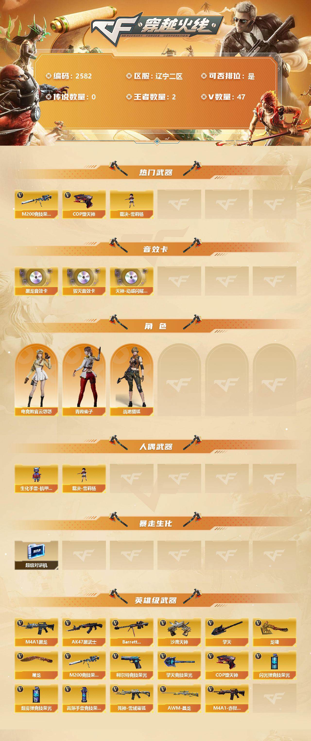[12315046]【商品标题】:辽宁二区-47V-2王者-0炫金 【热门武器】:M200-竞技荣光,裁决-雪莉杨,COP-堕天神 【音效卡】:天神-动感闪耀 音效卡,M4A1-黑龙音效卡,Barrett-毁灭音效卡 【角色】:电竞教官-云悠悠,战地猎狐,青霞仙子 【人偶武器】:裁决-雪莉杨,生化手雷-机甲核心 【暴走生化】:超级对讲机 【英雄级武器】:M200-竞技荣光,柯尔特-竞技荣光,擎天-竞技荣光*2,高爆手雷-竞技荣光*8,烟雾弹-竞技荣光*11,闪光弹-竞技荣光*8,COP-堕天神,M4A1-黑龙,AK47-黑武士,Barrett-毁灭,死神-雪域霜狐,AWM-昌龙,M4A1-赤狱骑士,沙鹰-天神,擎天,龙啸,屠龙 【特殊枪械】:
