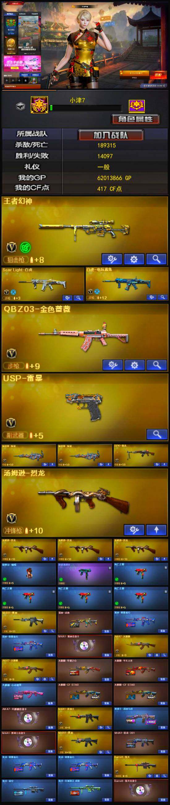 【热门武器】:QBZ03-金色蔷薇,Scar Light-白虎,死亡之眼*4,白虎-电玩蓝兔,M4A1-黑骑士,汤姆逊-烈龙*4,RPK-盘龙,加特林-炼狱*2,斯泰尔-蝴蝶,USP-雷暴,沙鹰-修罗*4