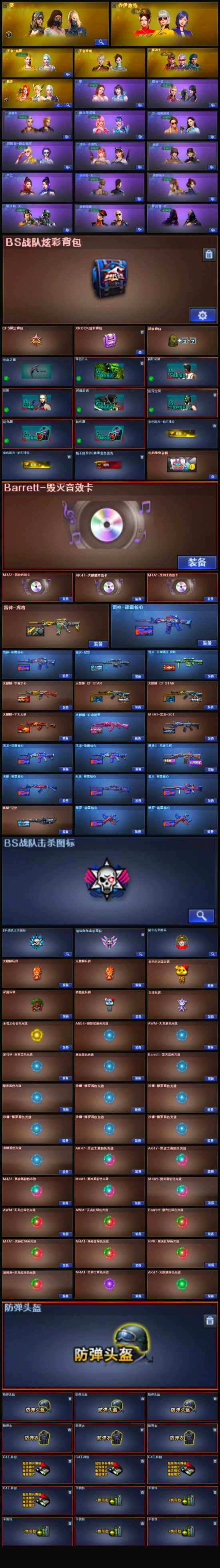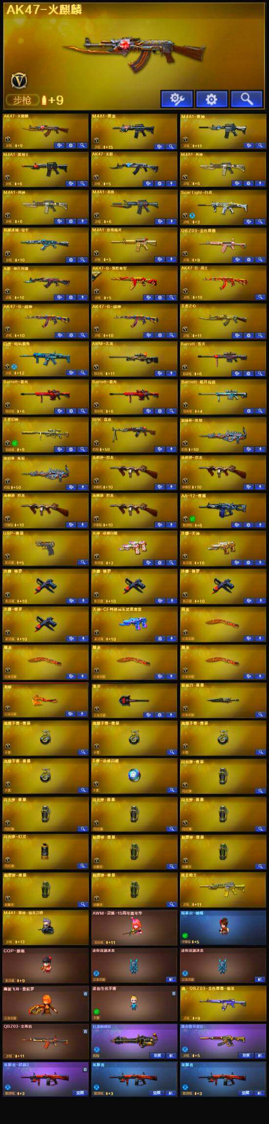【英雄级武器】:USP-雷暴,斩神刀-雷暴,天神-动感闪耀,手雷-动感闪耀,QBZ03-金色蔷薇,Scar Light-白虎,白虎-电玩蓝兔,无影-神兵利器,M4A1-雷神,M4A1-黑龙,M4A1-玫瑰精灵,M4A1-黑骑士,M4A1-死神*2,RPK-盘龙,加特林-炼狱*2,汤姆逊-烈龙*4,AK47-无影,AK47-火麒麟*2,AWM-天龙,Barrett-毁灭,Barrett-极光*2,M4A1-龙血,AA-12-雷霆,AK-47-猩红传说*7,AK47-B-战神*2,AK47-B-常胜将军,沙鹰-天神,沙鹰-修罗*4,擎天,龙啸,屠龙*4