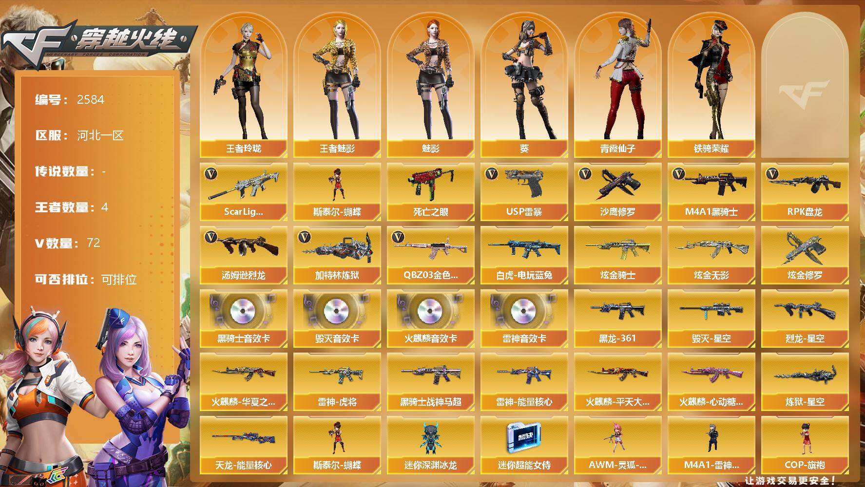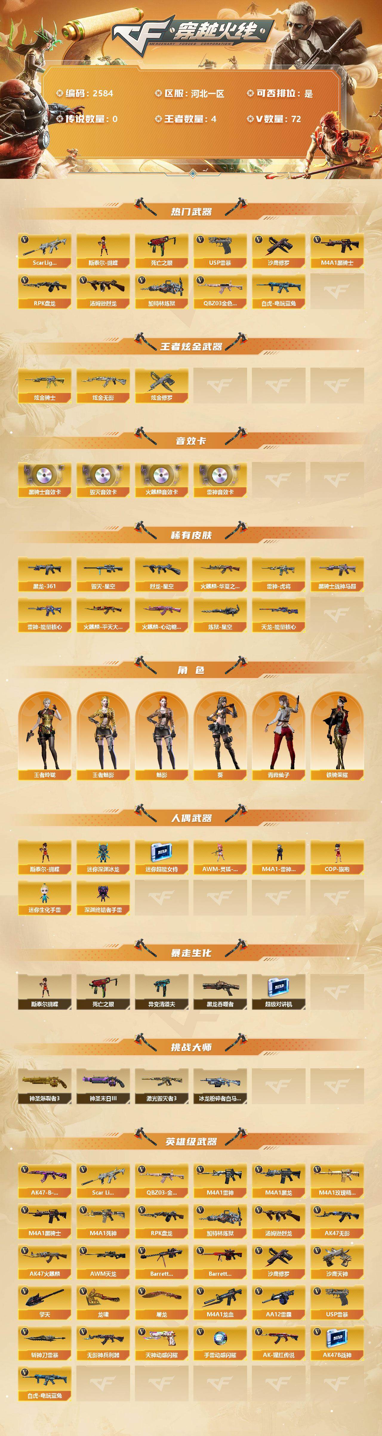 [12315137]【商品标题】:河北一区-72V-4王者-3炫金 【热门武器】:QBZ03-金色蔷薇,Scar Light-白虎,死亡之眼*4,白虎-电玩蓝兔,M4A1-黑骑士,汤姆逊-烈龙*4,RPK-盘龙,加特林-炼狱*2,斯泰尔-蝴蝶,USP-雷暴,沙鹰-修罗*4 【王者炫金武器】:炫金骑士,炫金无影,炫金修罗 【音效卡】:AK47-火麒麟音效卡,M4A1-雷神音效卡,M4A1-黑骑士音效卡,Barrett-毁灭音效卡 【稀有皮肤】:雷神-能量核心*2,雷神-虎将,火麒麟-华夏之心,火麒麟-平天大圣,火麒麟-心动糖果,黑骑士-战神马超,M4A1-黑龙-361,炼狱-星空,毁灭-星空,天龙-能量核心,烈龙-星空 【角色】:王者玲珑,王者-魅影,葵,魅影,铁骑荣耀,青霞仙子 【人偶武器】:斯泰尔-蝴蝶,AWM-灵狐-15周年嘉年华,M4A1-雷神-精英刀锋,COP-旗袍,迷你深渊冰龙*2,迷你超能女侍,迷你生化手雷,深渊终结者手雷 【暴走生化】:斯泰尔-蝴蝶,死亡之眼*4,异变清道夫,黑龙吞噬者,超级对讲机 【挑战大师】:神圣爆裂者III,神圣爆裂者-末日III*2,激光毁灭者III,冰龙粉碎者-白马银枪 【英雄级武器】:USP-雷暴,斩神刀-雷暴,天神-动感闪耀,手雷-动感闪耀,QBZ03-金色蔷薇,Scar Light-白虎,白虎-电玩蓝兔,无影-神兵利器,M4A1-雷神,M4A1-黑龙,M4A1-玫瑰精灵,M4A1-黑骑士,M4A1-死神*2,RPK-盘龙,加特林-炼狱*2,汤姆逊-烈龙*4,AK47-无影,AK47-火麒麟*2,AWM-天龙,Barrett-毁灭,Barrett-极光*2,M4A1-龙血,AA-12-雷霆,AK-47-猩红传说*7,AK47-B-战神*2,AK47-B-常胜将军,沙鹰-天神,沙鹰-修罗*4,擎天,龙啸,屠龙*4 【特殊枪械】:蝴蝶斯泰尔+4烈龙,1白虎,1黑骑士,4烈龙,1盘龙,2炼狱,1蝴蝶斯泰尔