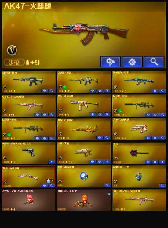 【英雄级武器】:烈火-动感闪耀,天神-动感闪耀,屠龙-动感闪耀,手雷-动感闪耀,G36C-幻影,QBZ03-金色蔷薇,M4A1-雷神,AK47-火麒麟,M200-幻神*2,沙鹰-天神,擎天