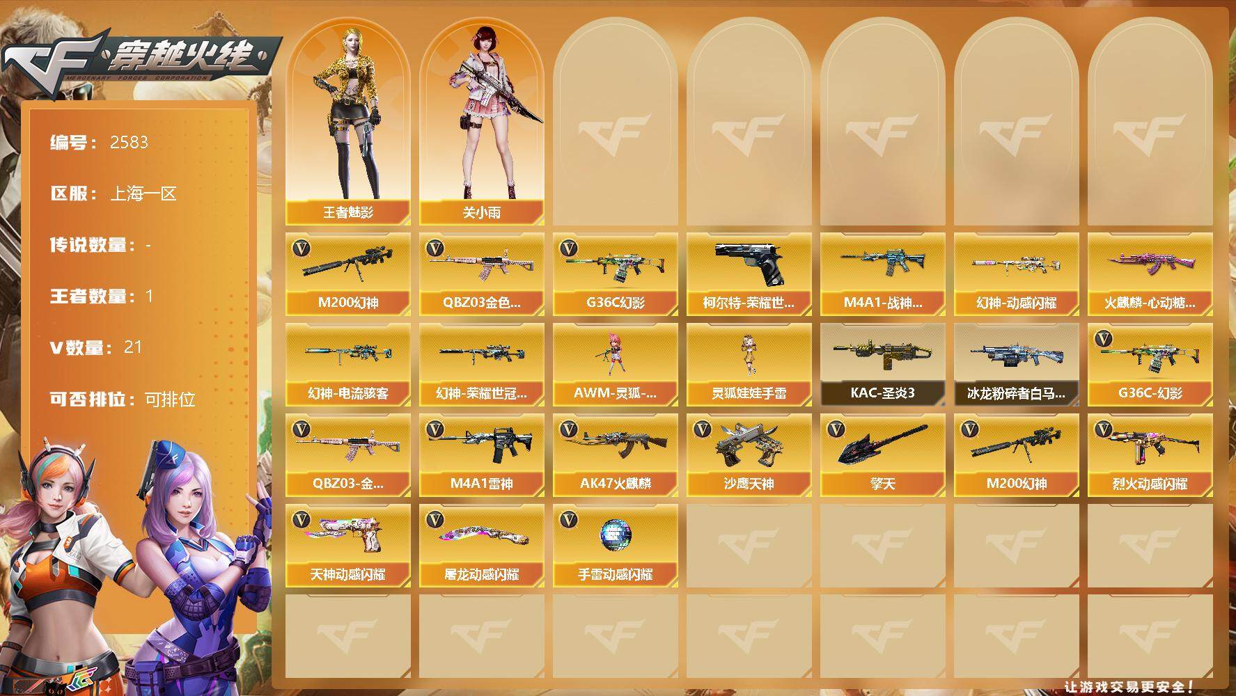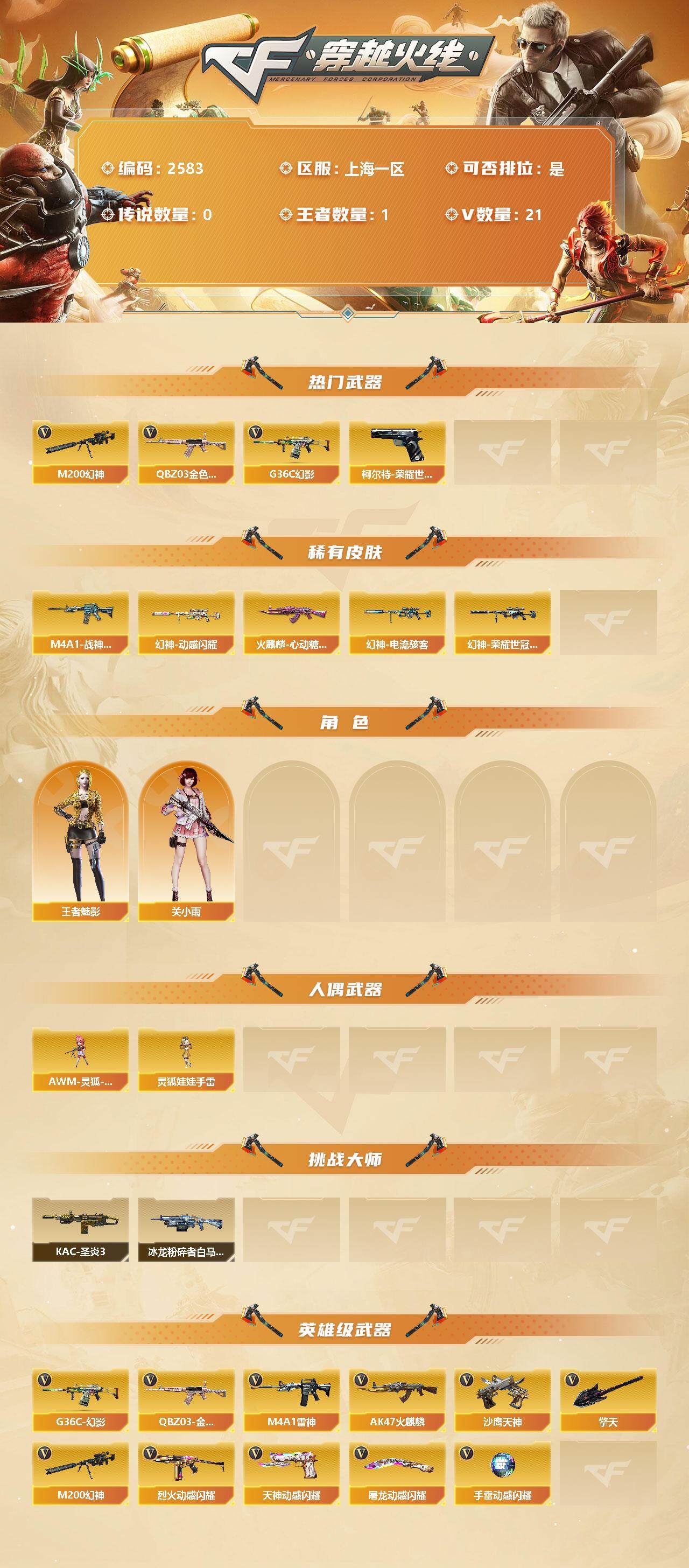 [12315120]【商品标题】:上海一区-21V-1王者-0炫金 【热门武器】:G36C-幻影,QBZ03-金色蔷薇,M200-幻神*2,柯尔特-荣耀世冠白鲨2023 【稀有皮肤】:幻神-动感闪耀 皮肤,幻神-电流骇客 皮肤,幻神-荣耀世冠白鲨2023 皮肤,M4A1-战神赵云,火麒麟-心动糖果 【角色】:王者-魅影,关小雨 【人偶武器】:AWM-灵狐-15周年嘉年华,灵狐娃娃手雷 【挑战大师】:KAC-圣炎切割者III,冰龙粉碎者-白马银枪 【英雄级武器】:烈火-动感闪耀,天神-动感闪耀,屠龙-动感闪耀,手雷-动感闪耀,G36C-幻影,QBZ03-金色蔷薇,M4A1-雷神,AK47-火麒麟,M200-幻神*2,沙鹰-天神,擎天 【特殊枪械】: