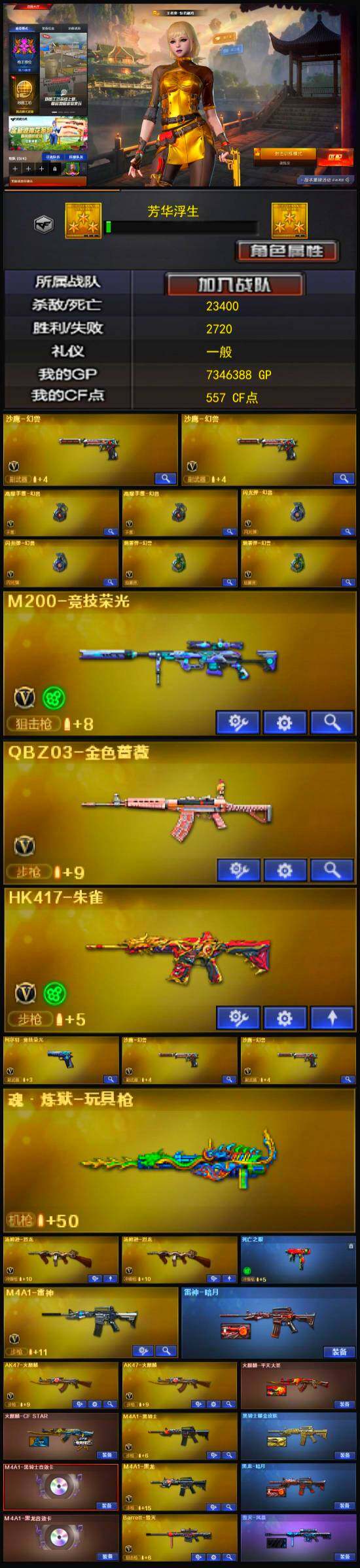 - [12044601]【商品标题】:河南二区-53V-9王者-0炫金 【热门武器】:QBZ03-金色蔷薇,M14EBR-玄武,Scar Light-白虎,M200-幻神,M200-竞技荣光,凤吟之魄,Kar98K-星神,金色小号,Cat-刀锋,毒蜂,牛牛-AK47,汤姆逊-烈龙*5,MK5-炽火炎龙,USP-雷暴,沙鹰-修罗*2,荣耀世冠-龙啸 【王者炫金武器】:凤吟之魄,王者凌虎 【音效卡】:M4A1-黑骑士音效卡 【稀有皮肤】:Kar98K-星神-冠军之星皮肤,白虎-白鲨-CFPLS23冠军,雷神-荣耀之魄,雷神-星空,雷神-传奇N9,雷神-R.LGD-CFPLS18冠军,火麒麟-轻羽皮肤,火麒麟-战神关羽,火麒麟-平天大圣,火麒麟-心动糖果,毁灭-荣耀之怒,毁灭耀金皮肤,毁灭-风暴,屠龙-荣耀之锋 【角色】:王者炫,王者-魅影,零,电竞教官-云悠悠,战地猎狐,蜀雪,炽天使,暗黑审判,青霞仙子 【人偶武器】:MK5-炽火炎龙,Cat-刀锋,牛牛-AK47,迷你深渊冰龙,迷你超能女侍,迷你巨石泰坦-魔花研究所,迷你裂空之翼*3,迷你牛魔王,迷你波特博士,夺魂*2,迷你生化手雷*2,深渊终结者手雷,闪光弹-貂蝉,高爆手雷-大乔 【暴走生化】:毒蜂,黑龙吞噬者,超级对讲机 【挑战大师】:神圣爆裂者-末日III,KAC-圣炎切割者III,激光毁灭者III,VEPR-12-金魔,激光毁灭者III-白马银枪*2,冰龙粉碎者-白马银枪 【英雄级武器】:M200-竞技荣光,柯尔特-竞技荣光,擎天-竞技荣光,高爆手雷-竞技荣光,烟雾弹-竞技荣光,闪光弹-竞技荣光,USP-雷暴,荣耀世冠-龙啸,QBZ03-金色蔷薇,M14EBR-玄武,Scar Light-白虎,无影-神兵利器,M4A1-雷神,汤姆逊-烈龙*5,AK47-火麒麟,AK47-黑武士,Barrett-毁灭,Barrett-极光,AWM-裁决,AA-12-雷霆,Kar98K-星神,Barrett-朱雀,M200-幻神,AK47-黑鲨,AK-47-猩红传说,AK47-B-战神,AK47-B-常胜将军,AWM-昌龙,M4A1-赤狱骑士,沙鹰-修罗*2,麒麟刺,屠龙,擎天-云海游龙 【特殊枪械】:1白虎,5烈龙