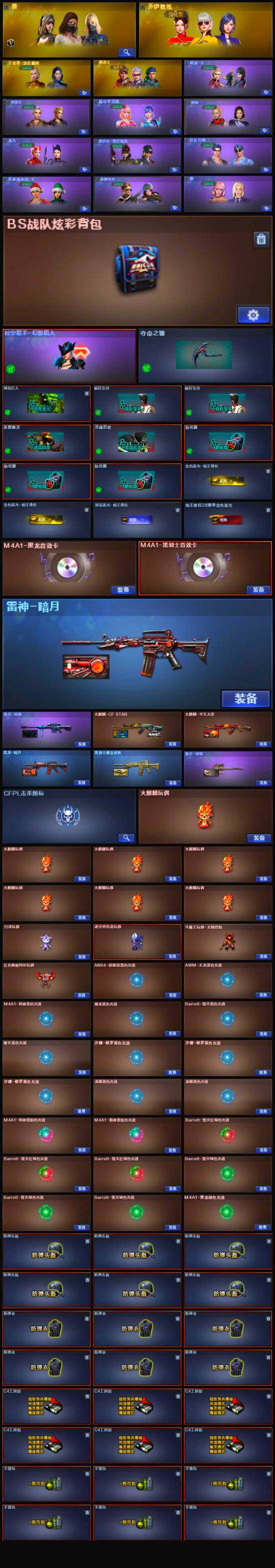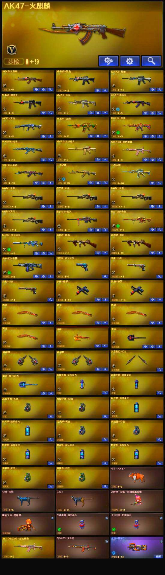【英雄级武器】:M200-竞技荣光,柯尔特-竞技荣光,擎天-竞技荣光,高爆手雷-竞技荣光*2,烟雾弹-竞技荣光*3,闪光弹-竞技荣光*2,沙鹰-幻兽*2,女皇利刃-幻兽,M4A1-武圣,QBZ03-金色蔷薇,HK417-朱雀,无影-神兵利器,M4A1-雷神,M4A1-黑龙,M4A1-玫瑰精灵,M4A1-黑骑士,M4A1-死神,汤姆逊-烈龙*2,AK47-火麒麟*2,AK47-黑武士,AK12-天启,AWM-天龙*4,Barrett-毁灭,AA-12-雷霆,Barrett-朱雀,沙鹰-修罗*2,麒麟刺*2,擎天,龙啸,屠龙*4,高爆手雷-幻兽*2