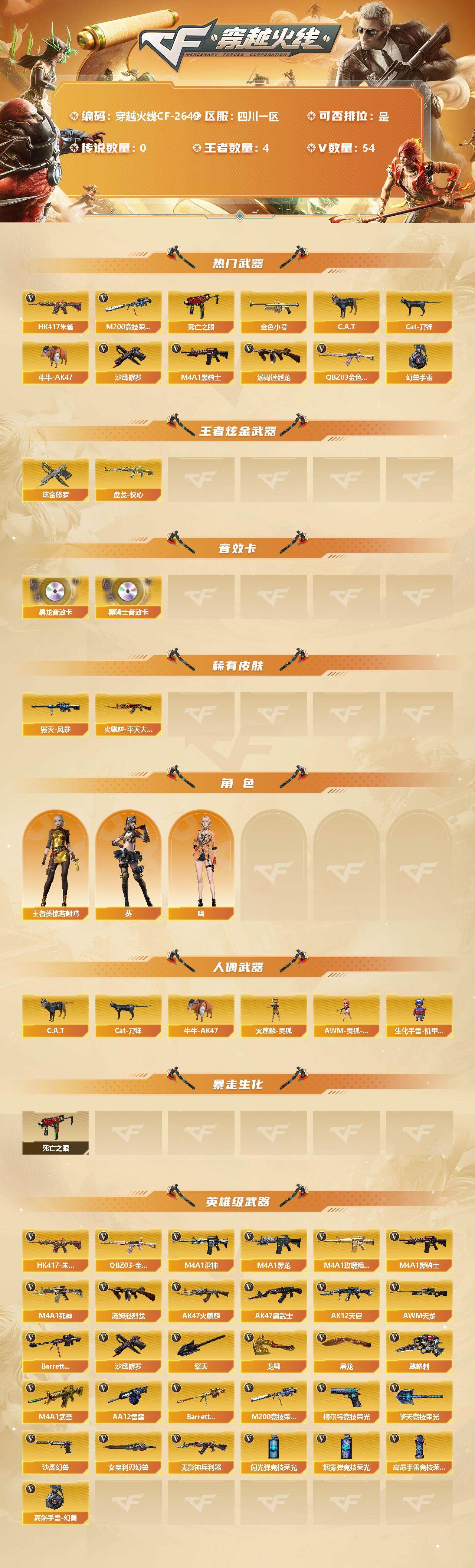 [12315051]【商品标题】:四川一区-54V-4王者-1炫金 【热门武器】:QBZ03-金色蔷薇,HK417-朱雀,M200-竞技荣光,死亡之眼,金色小号,C.A.T,Cat-刀锋,牛牛-AK47,M4A1-黑骑士,汤姆逊-烈龙*2,沙鹰-修罗*2,高爆手雷-幻兽*2 【王者炫金武器】:炫金修罗,盘龙-悦心 【音效卡】:M4A1-黑龙音效卡,M4A1-黑骑士音效卡 【稀有皮肤】:火麒麟-平天大圣,毁灭-风暴 【角色】:王者葵-惊若翩鸿,葵,幽 【人偶武器】:火麒麟-灵狐,AWM-灵狐-15周年嘉年华,C.A.T,Cat-刀锋,牛牛-AK47,生化手雷-机甲核心*2 【暴走生化】:死亡之眼 【英雄级武器】:M200-竞技荣光,柯尔特-竞技荣光,擎天-竞技荣光,高爆手雷-竞技荣光*2,烟雾弹-竞技荣光*3,闪光弹-竞技荣光*2,沙鹰-幻兽*2,女皇利刃-幻兽,M4A1-武圣,QBZ03-金色蔷薇,HK417-朱雀,无影-神兵利器,M4A1-雷神,M4A1-黑龙,M4A1-玫瑰精灵,M4A1-黑骑士,M4A1-死神,汤姆逊-烈龙*2,AK47-火麒麟*2,AK47-黑武士,AK12-天启,AWM-天龙*4,Barrett-毁灭,AA-12-雷霆,Barrett-朱雀,沙鹰-修罗*2,麒麟刺*2,擎天,龙啸,屠龙*4,高爆手雷-幻兽*2 【特殊枪械】:1黑骑士,2烈龙