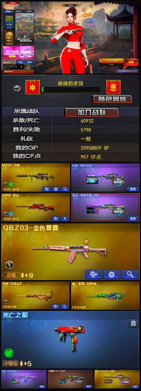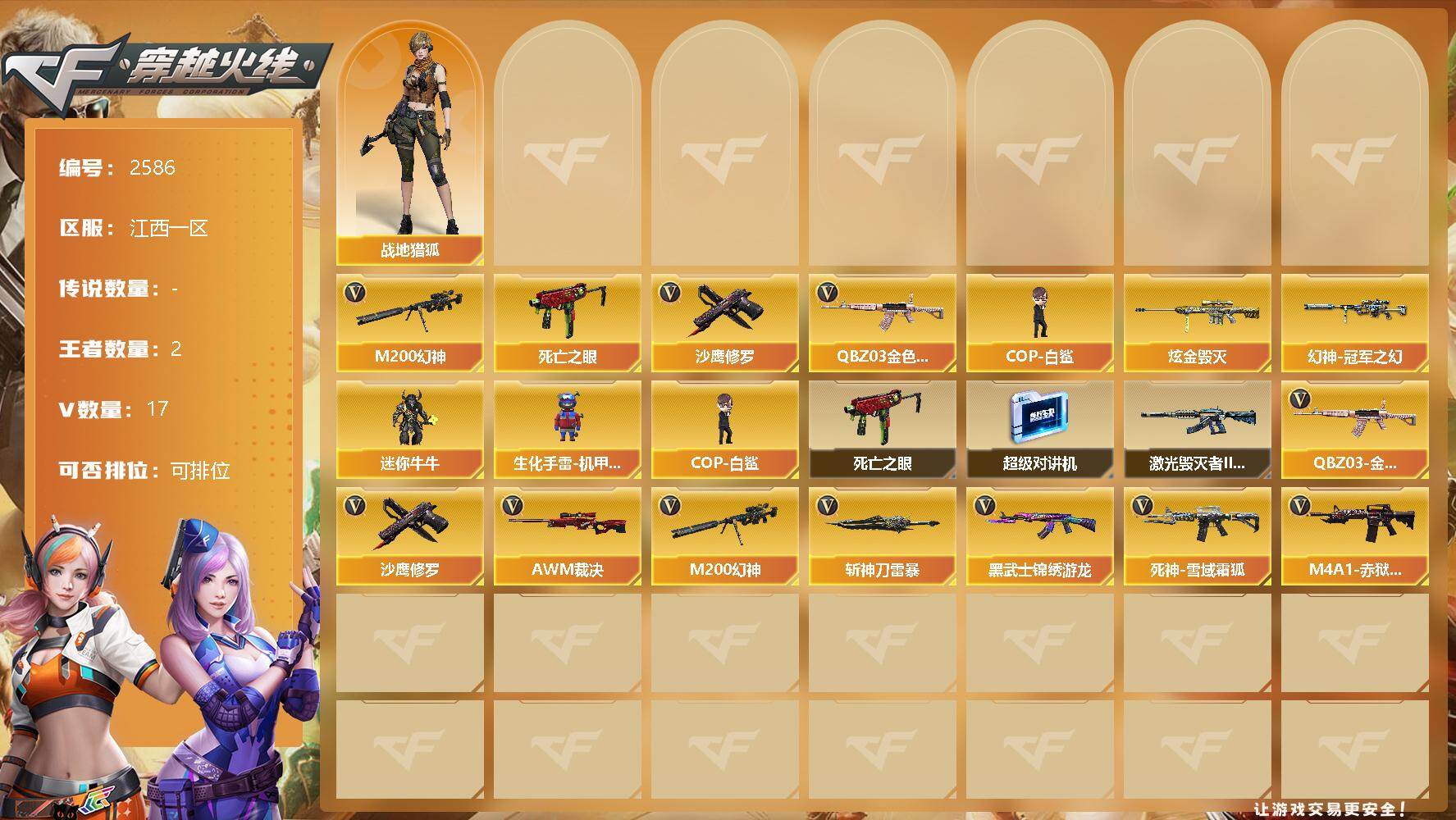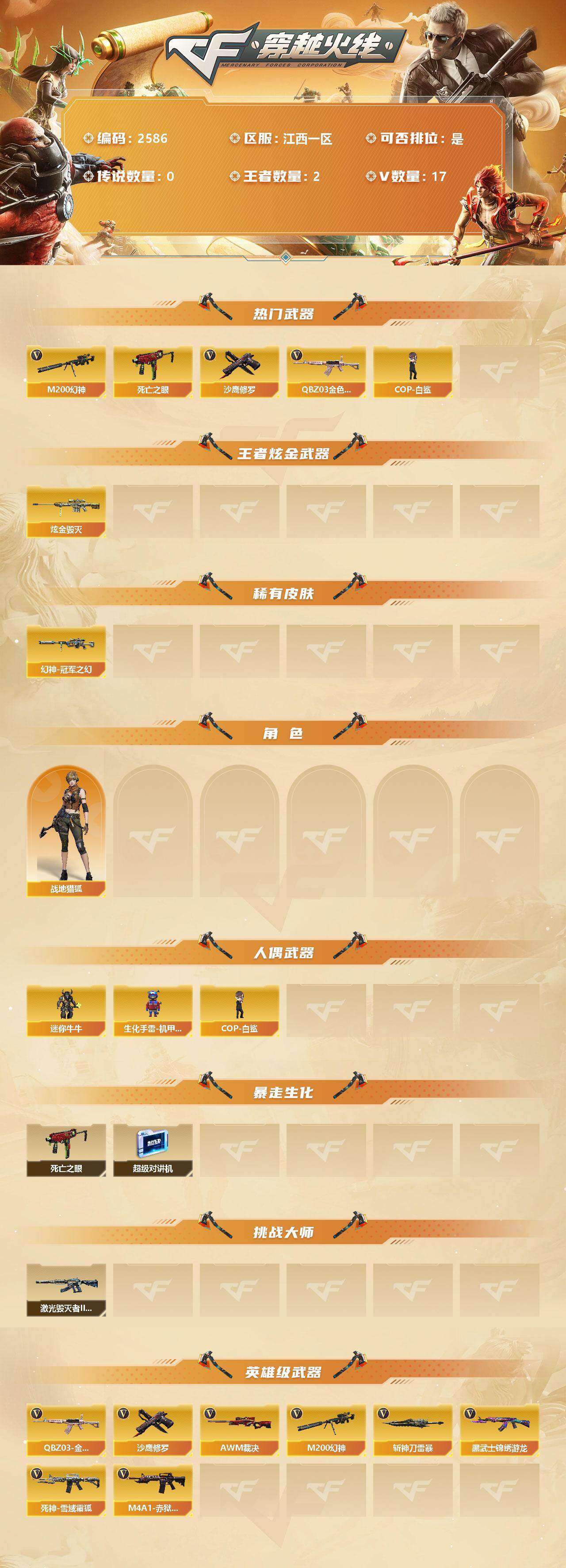 [12315309]【商品标题】:江西一区-17V-2王者-1炫金 【热门武器】:QBZ03-金色蔷薇,M200-幻神,死亡之眼,COP-白鲨,沙鹰-修罗 【王者炫金武器】:炫金毁灭 【稀有皮肤】:幻神-冠军之幻 【角色】:战地猎狐 【人偶武器】:COP-白鲨,迷你牛牛,生化手雷-机甲核心 【暴走生化】:死亡之眼,超级对讲机 【挑战大师】:激光毁灭者III-白马银枪 【英雄级武器】:斩神刀-雷暴,QBZ03-金色蔷薇,AWM-裁决,M200-幻神,黑武士-锦绣游龙,死神-雪域霜狐,M4A1-赤狱骑士,沙鹰-修罗 【特殊枪械】:
