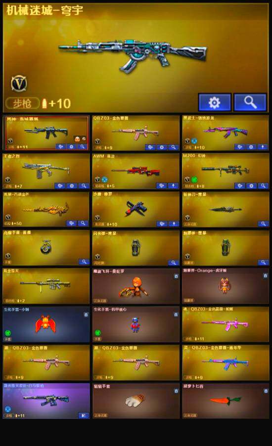 【英雄级武器】:斩神刀-雷暴,QBZ03-金色蔷薇,AWM-裁决,M200-幻神,黑武士-锦绣游龙,死神-雪域霜狐,M4A1-赤狱骑士,沙鹰-修罗