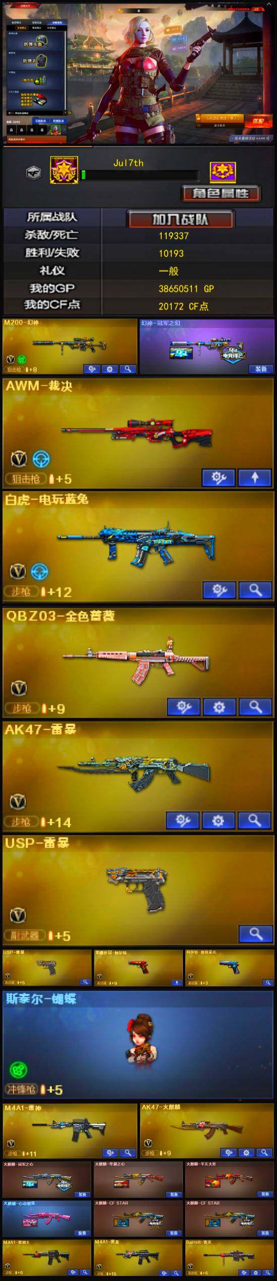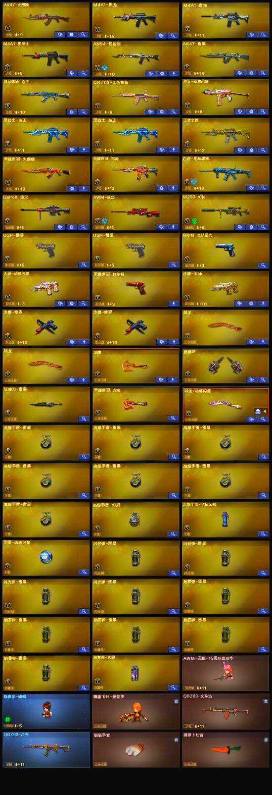 【热门武器】:QBZ03-金色蔷薇,M200-幻神,荣耀世冠-火麒麟,荣耀世冠-雷神,白虎-电玩蓝兔,荣耀世冠-柯尔特,M4A1-黑骑士,斯泰尔-蝴蝶,USP-雷暴*2,沙鹰-修罗*2,荣耀世冠-龙啸