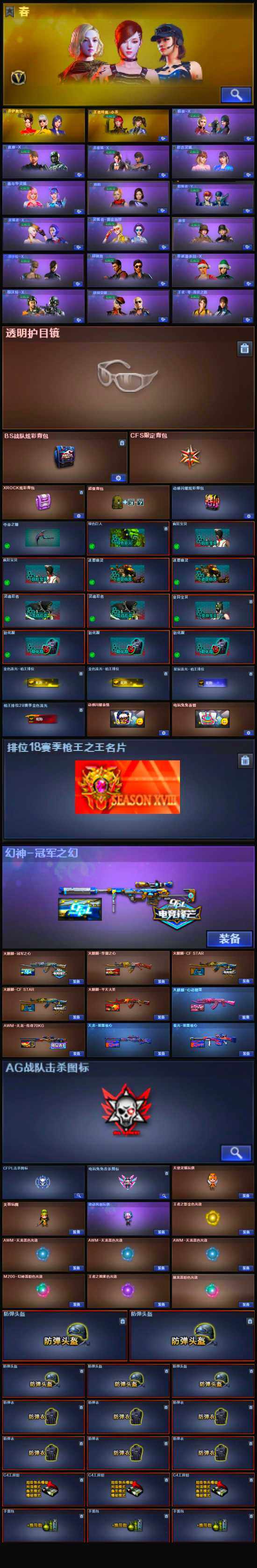 - [12421478]【商品标题】:云南一区-33V-16王者-0炫金 【热门武器】:王者星神,QBZ03-金色蔷薇,M200-幻神,白虎-电玩蓝兔,M4A1-黑骑士,羊驼玩偶,COP 357-雷霆王者,沙鹰-修罗*3 【王者炫金武器】:王者之戮,玫瑰精灵-悦动,王者雷怒,王者星神,COP 357-雷霆王者 【音效卡】:Barrett-毁灭音效卡,AWM-裁决音效卡 【稀有皮肤】:幻神-冠军之幻,幻神-AG-CFPL S24冠军 皮肤,雷神-耀金皮肤,雷神-R.LGD-CFPLS18冠军,黑骑士-暗月,毁灭-战神张飞,擎天-冠军之击 【角色】:王者之瞳,王者玲珑,王者-魅影,零,瞳,战地猎狐,铁骑荣耀,暗黑审判,青霞仙子 【人偶武器】:星神-炽天使,火麒麟-灵狐,AWM-灵狐-15周年嘉年华,M4A1-雷神-精英刀锋,迷你深渊冰龙,迷你超能女侍,迷你巨石泰坦-魔花研究所,迷你牛魔王,迷你波特博士*2,夺魂,深渊终结者手雷 【暴走生化】:双面神,超级对讲机 【挑战大师】:神圣爆裂者-末日III,冰龙粉碎者-白马银枪,致命乱世-超越Max 【英雄级武器】:QBZ03-金色蔷薇,白虎-电玩蓝兔,无影-神兵利器,M4A1-雷神,M4A1-黑龙,M4A1-黑骑士,Barrett-毁灭,AWM-裁决,AA-12-雷霆,M200-幻神,黑武士-锦绣游龙,AK-47-猩红传说*2,AK47-B-战神,M4A1-赤狱骑士,沙鹰-天神,沙鹰-修罗*3,麒麟刺,擎天,龙啸,屠龙*2 【特殊枪械】:1黑骑士