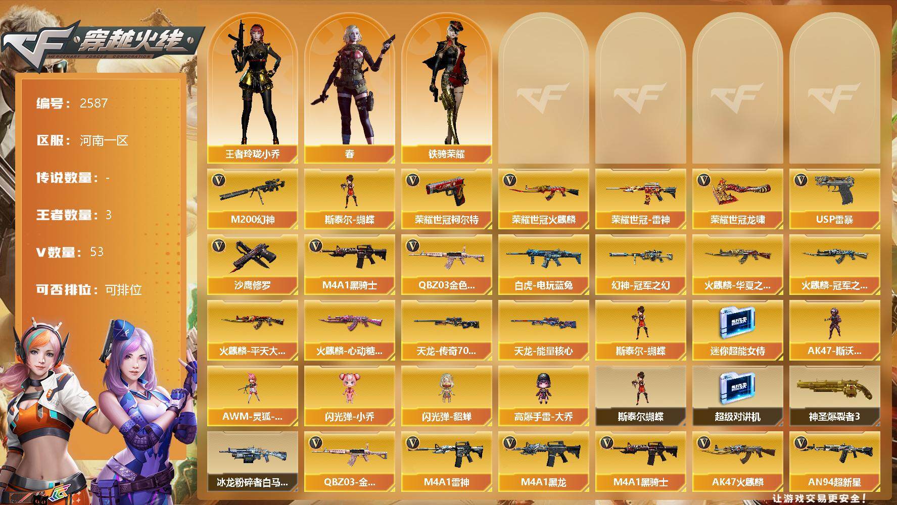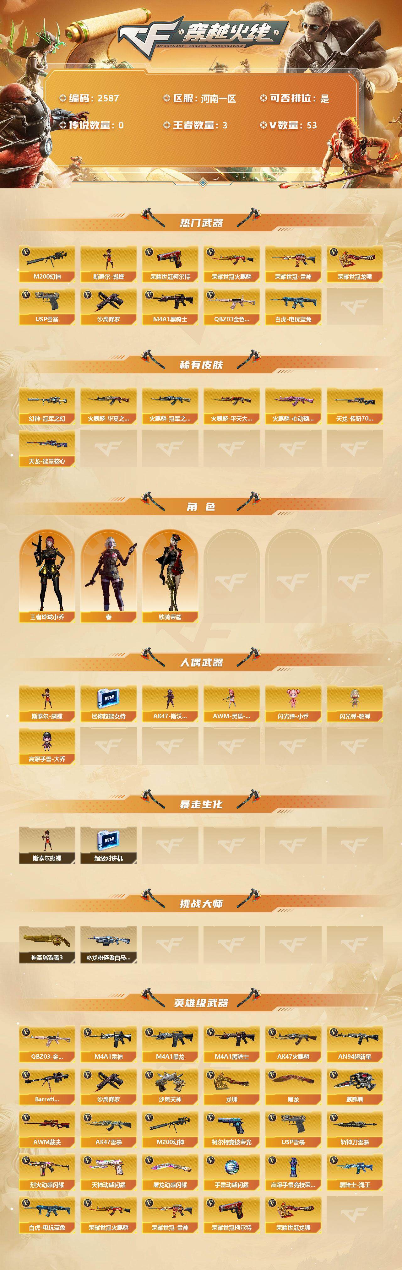 [12315332]【商品标题】:河南一区-53V-3王者-0炫金 【热门武器】:QBZ03-金色蔷薇,M200-幻神,荣耀世冠-火麒麟,荣耀世冠-雷神,白虎-电玩蓝兔,荣耀世冠-柯尔特,M4A1-黑骑士,斯泰尔-蝴蝶,USP-雷暴*2,沙鹰-修罗*2,荣耀世冠-龙啸 【稀有皮肤】:幻神-冠军之幻,火麒麟-冠军之心,火麒麟-华夏之心,火麒麟-平天大圣,火麒麟-心动糖果,天龙-能量核心,AWM-天龙-传奇70KG 【角色】:王者玲珑-小乔,春,铁骑荣耀 【人偶武器】:斯泰尔-蝴蝶,AK47-斯沃特,AWM-灵狐-15周年嘉年华,迷你超能女侍,闪光弹-小乔,闪光弹-貂蝉,高爆手雷-大乔 【暴走生化】:斯泰尔-蝴蝶,超级对讲机 【挑战大师】:神圣爆裂者III,冰龙粉碎者-白马银枪 【英雄级武器】:柯尔特-竞技荣光,高爆手雷-竞技荣光,AK47-雷暴,USP-雷暴*2,斩神刀-雷暴,荣耀世冠-火麒麟,荣耀世冠-雷神,荣耀世冠-柯尔特,荣耀世冠-龙啸,烈火-动感闪耀,天神-动感闪耀,屠龙-动感闪耀,手雷-动感闪耀,QBZ03-金色蔷薇,白虎-电玩蓝兔,M4A1-雷神,M4A1-黑龙,M4A1-黑骑士,AK47-火麒麟,AN94-超新星,Barrett-毁灭,AWM-裁决,M200-幻神,黑骑士-海王*2,沙鹰-天神,沙鹰-修罗*2,麒麟刺,龙啸,屠龙*2 【特殊枪械】:蝴蝶斯泰尔+0烈龙,1黑骑士,1蝴蝶斯泰尔