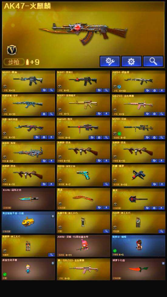 【英雄级武器】:QBZ03-金色蔷薇,无影-神兵利器,M4A1-雷神,M4A1-玫瑰精灵,M4A1-黑骑士,加特林-炼狱,汤姆逊-烈龙*3,AK47-火麒麟,AN94-超新星,Barrett-毁灭,M200-幻神,柯尔特-冠军之特,沙鹰-修罗,擎天,屠龙