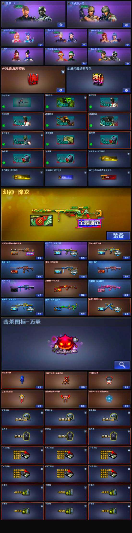 【稀有皮肤】:M200-幻神-黄忠皮肤,幻神-降龙,QBZ03-冠军之薇,雷神-冠军之魄,火麒麟-平天大圣,火麒麟-心动糖果,黑骑士-冠军之势,毁灭-暗月,毁灭-冠军之怒,毁灭-风暴,修罗-冠军之魂