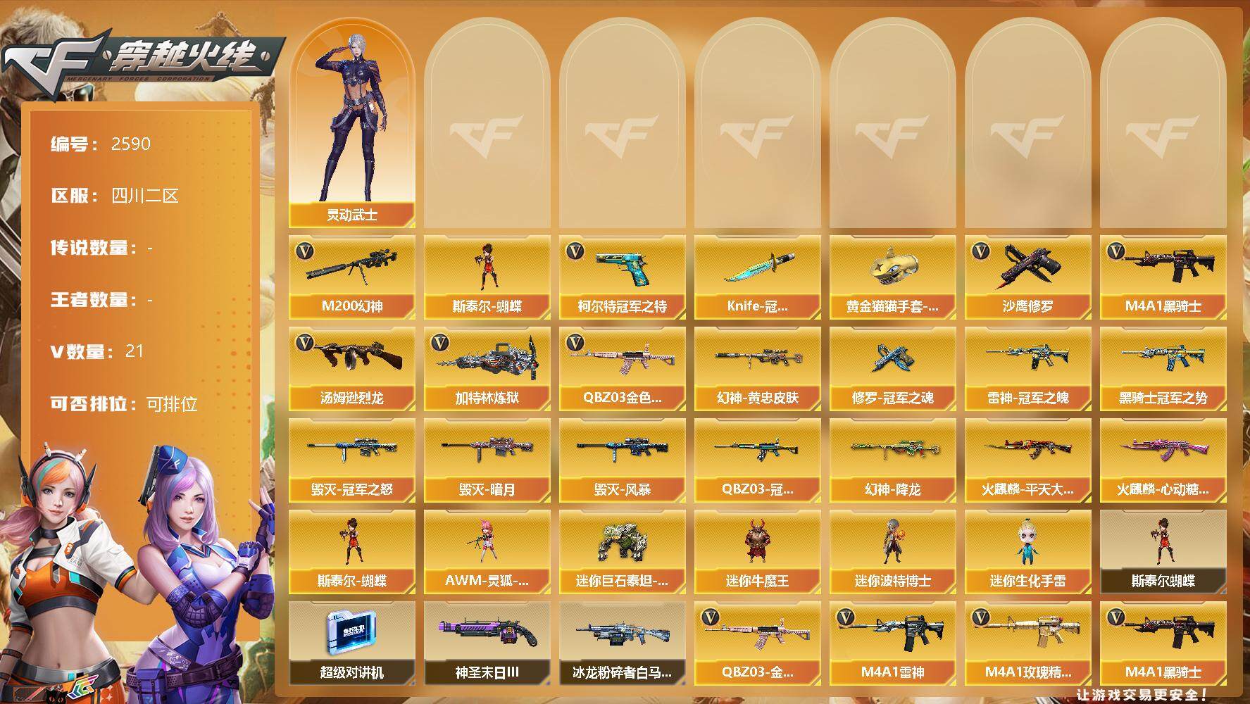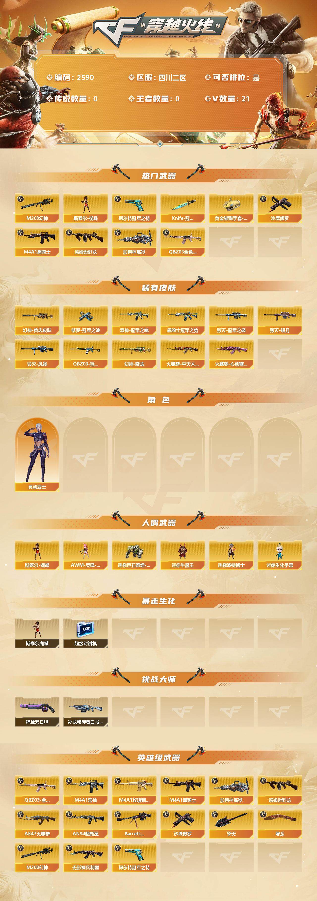 [12315421]【商品标题】:四川二区-21V-0王者-0炫金 【热门武器】:QBZ03-金色蔷薇,M200-幻神,柯尔特-冠军之特,M4A1-黑骑士,汤姆逊-烈龙*3,加特林-炼狱,斯泰尔-蝴蝶,沙鹰-修罗,Knife-冠军之刃,黄金猫猫手套-白鲨 【稀有皮肤】:M200-幻神-黄忠皮肤,幻神-降龙,QBZ03-冠军之薇,雷神-冠军之魄,火麒麟-平天大圣,火麒麟-心动糖果,黑骑士-冠军之势,毁灭-暗月,毁灭-冠军之怒,毁灭-风暴,修罗-冠军之魂 【角色】:灵动武士 【人偶武器】:斯泰尔-蝴蝶,AWM-灵狐-15周年嘉年华,迷你巨石泰坦-魔花研究所,迷你牛魔王,迷你波特博士,迷你生化手雷 【暴走生化】:斯泰尔-蝴蝶,超级对讲机 【挑战大师】:神圣爆裂者-末日III,冰龙粉碎者-白马银枪 【英雄级武器】:QBZ03-金色蔷薇,无影-神兵利器,M4A1-雷神,M4A1-玫瑰精灵,M4A1-黑骑士,加特林-炼狱,汤姆逊-烈龙*3,AK47-火麒麟,AN94-超新星,Barrett-毁灭,M200-幻神,柯尔特-冠军之特,沙鹰-修罗,擎天,屠龙 【特殊枪械】:蝴蝶斯泰尔+3烈龙,1黑骑士,3烈龙,1炼狱,1蝴蝶斯泰尔