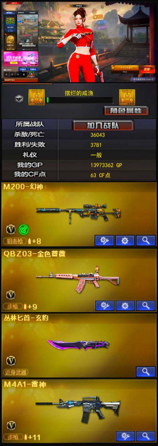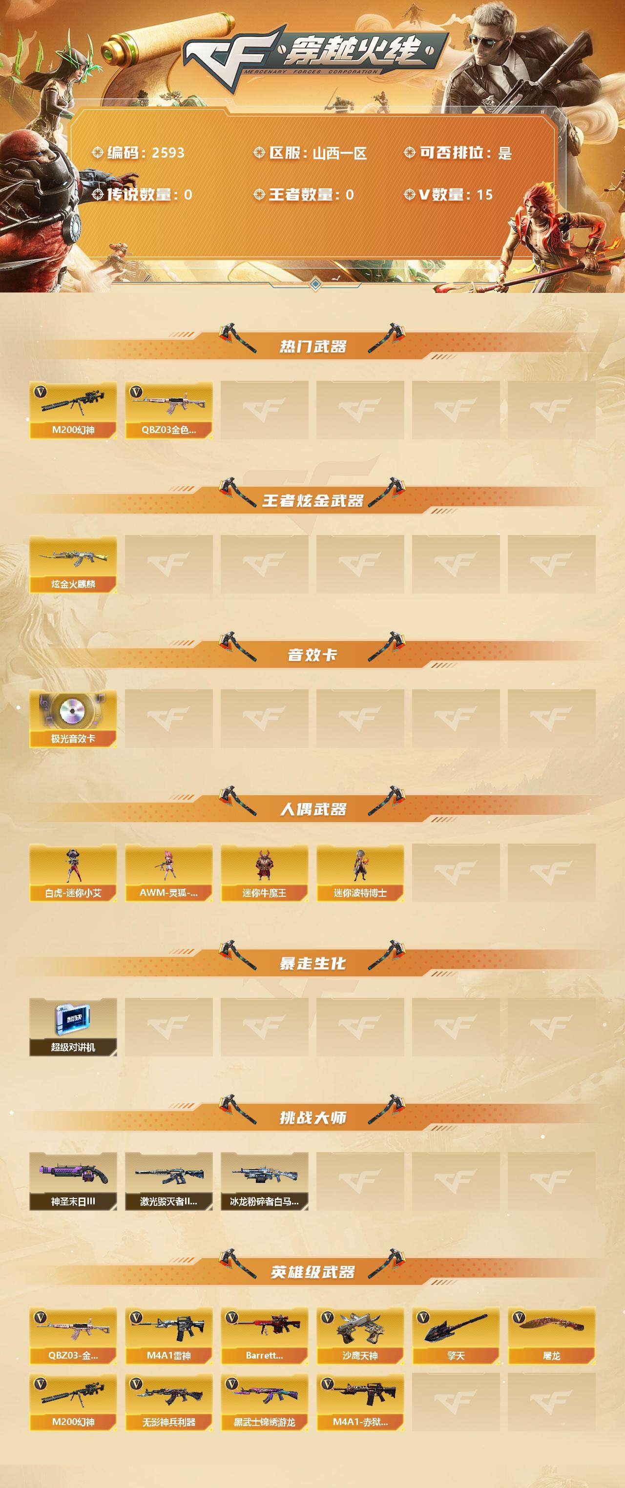 [12315510]【商品标题】:山西一区-15V-0王者-1炫金 【热门武器】:QBZ03-金色蔷薇,M200-幻神 【王者炫金武器】:炫金火麒麟 【音效卡】:Barrett-极光音效卡 【人偶武器】:白虎-迷你小艾,AWM-灵狐-15周年嘉年华,迷你牛魔王,迷你波特博士 【暴走生化】:超级对讲机 【挑战大师】:神圣爆裂者-末日III,激光毁灭者III-白马银枪,冰龙粉碎者-白马银枪 【英雄级武器】:QBZ03-金色蔷薇,无影-神兵利器,M4A1-雷神,Barrett-极光,M200-幻神,黑武士-锦绣游龙,M4A1-赤狱骑士,沙鹰-天神,擎天,屠龙 【特殊枪械】: