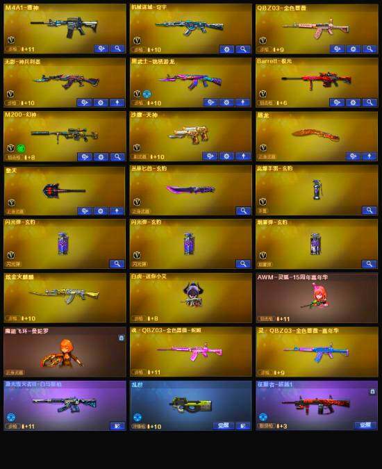 【英雄级武器】:QBZ03-金色蔷薇,无影-神兵利器,M4A1-雷神,Barrett-极光,M200-幻神,黑武士-锦绣游龙,M4A1-赤狱骑士,沙鹰-天神,擎天,屠龙