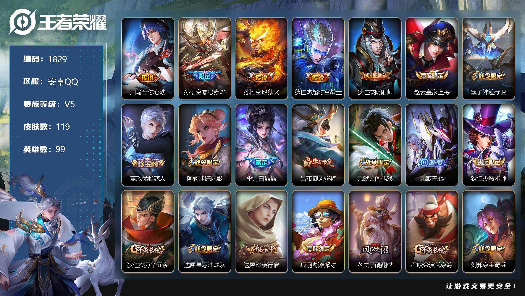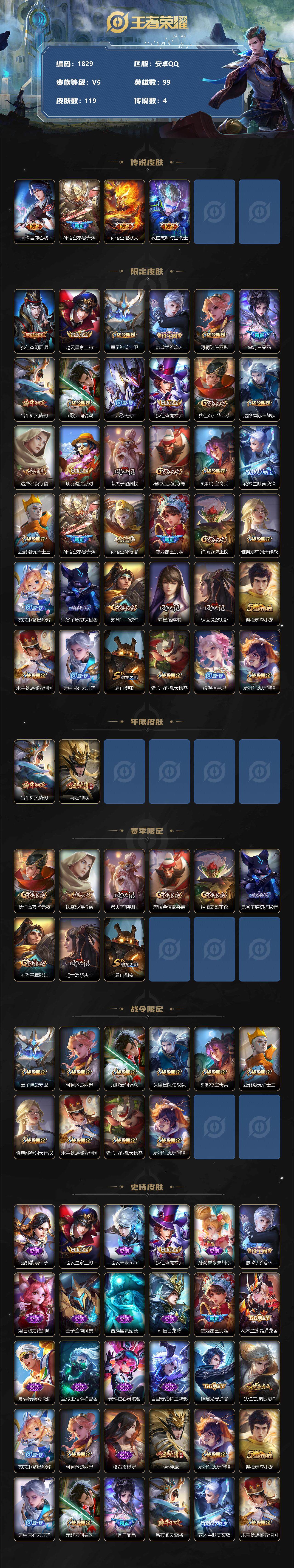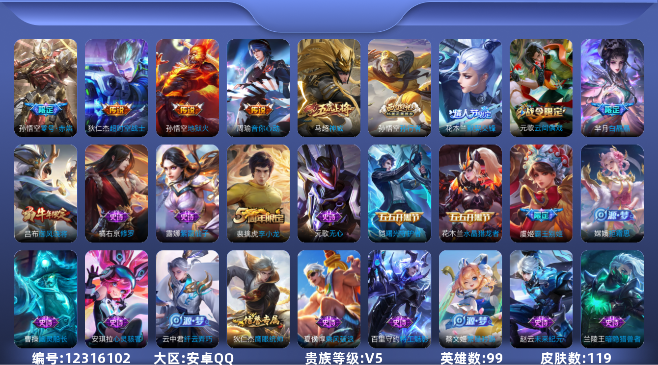 [12316102]【商品标题】:安卓Q-V5-永恒钻石II段位-99英雄-119皮肤-0典藏-0珍品无双-0无双-0珍品传说-4传说-34史诗