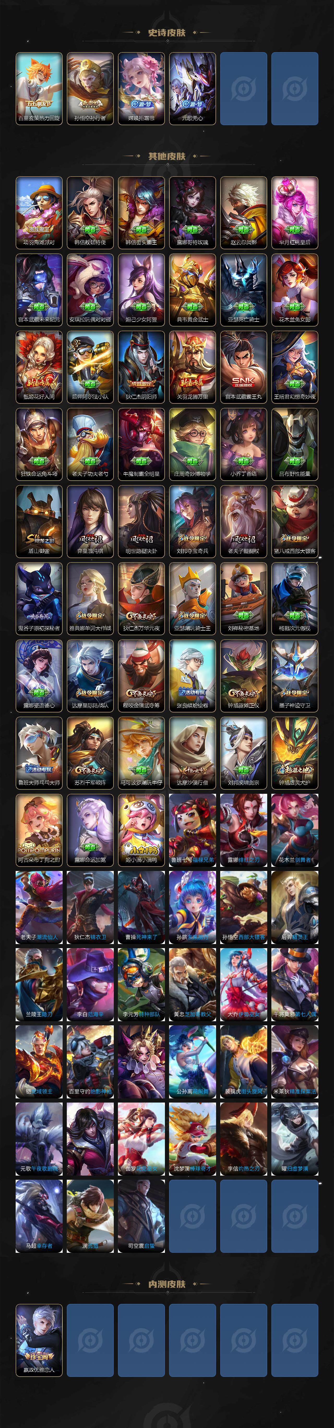 【史诗皮肤】:露娜紫霞仙子,赵云皇家上将,赵云未来纪元,狄仁杰魔术师,孙尚香水果甜心,嬴政优雅恋人,妲己魅力维加斯,墨子金属风暴,曹操幽灵船长,韩信白龙吟,虞姬霸王别姬,花木兰水晶猎龙者,夏侯惇乘风破浪,兰陵王暗隐猎兽者,安琪拉心灵骇客,百里守约特工魅影,铠曙光守护者,狄仁杰鹰眼统帅,蔡文姬繁星吟游,阿轲迷踪丽影,橘右京修罗,马超神威,蒙犽狂想玩偶喵,裴擒虎李小龙,云中君纤云弄巧,元歌云间偶戏,芈月白晶晶,吕布御风骁将,花木兰默契交锋,米莱狄胡桃异想国,百里玄策热力回旋,孙悟空孙行者,嫦娥拒霜思,元歌无心