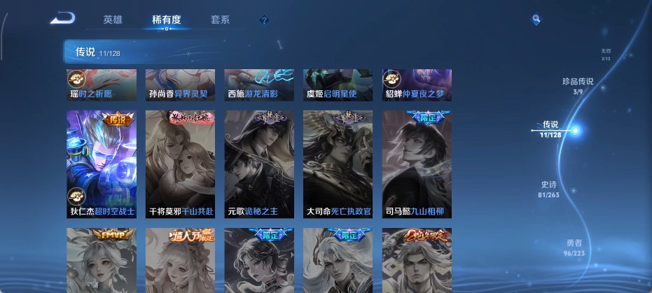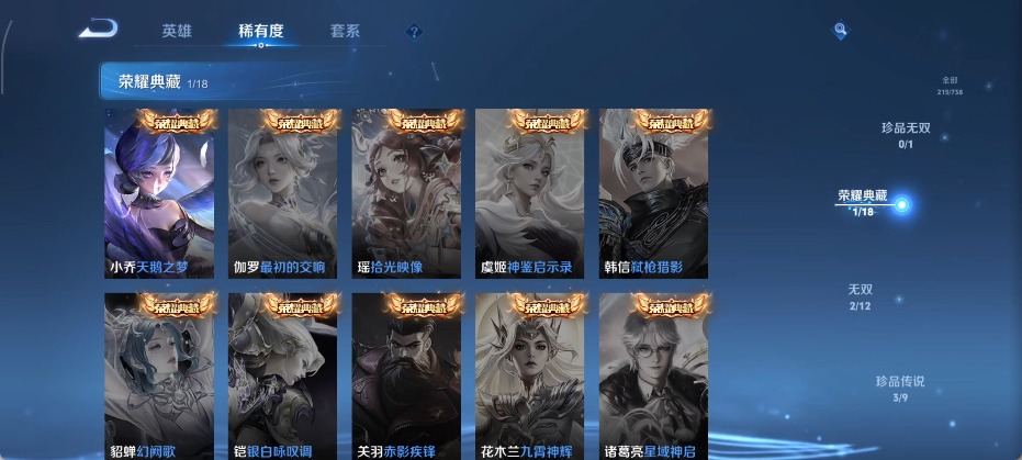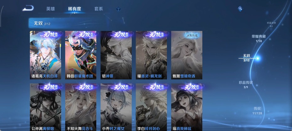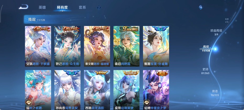 大乔白鹤梁神女,甄姬女儿国国王,甄姬至美·化雀舞,廉颇寅虎·御盾,孙膑天狼运算者,孙膑寅虎·展翼,干将莫邪冰霜恋舞曲,孙尚香异界灵契,后羿辉光之辰,镜匿光追影者,庄周云端筑梦师,杨玉环寅虎·心曲,公孙离蜜橘之夏,上官婉儿梁祝,西施至美·乘鲤谣,桑启鸣野蒿,女娲愿照·千秋盛,妲己愿照·众生和,蔡文姬奇迹圣诞,蔡文姬愿照·福禄聚,瑶时之祈愿,瑶山海·碧波行,嫦娥如梦令