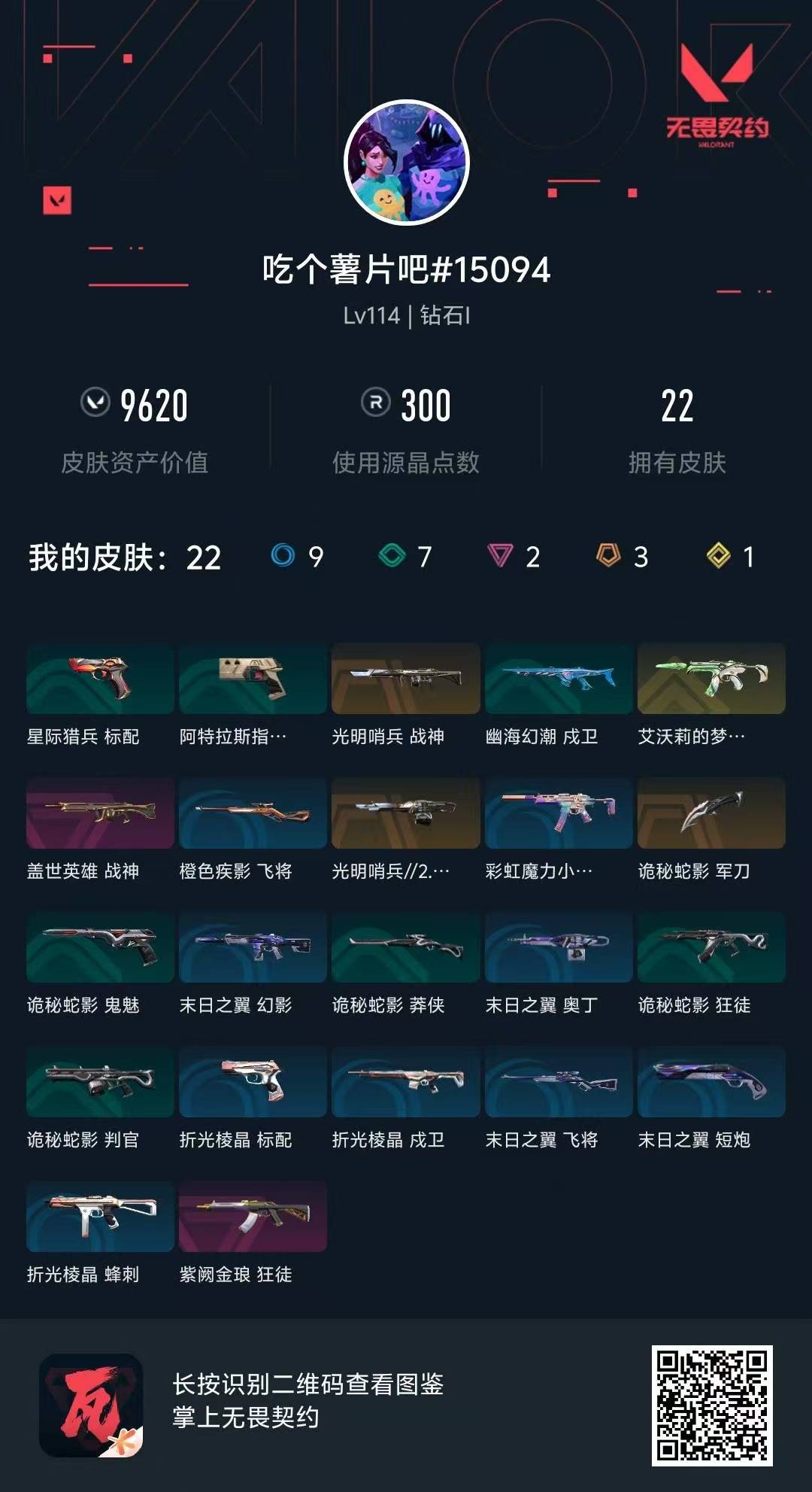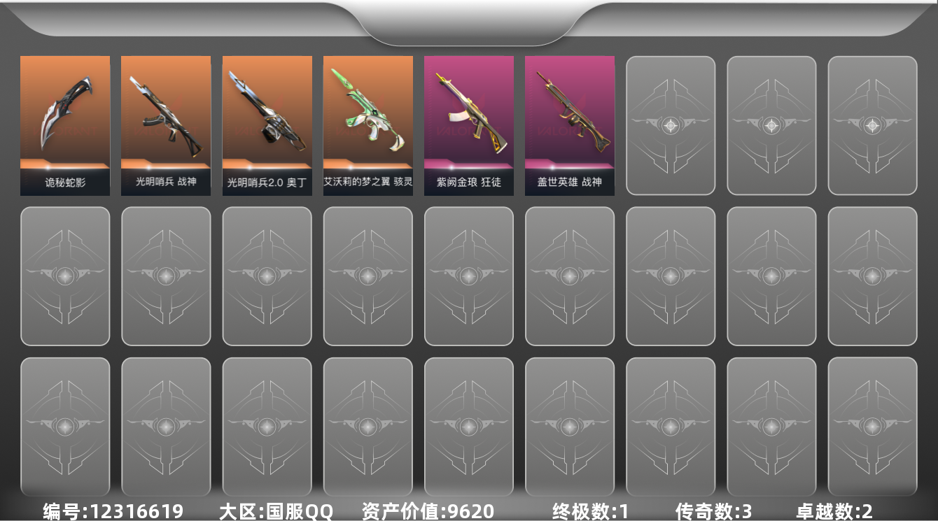 - [8623504]Lv97 ,铂金III,英雄18,皮肤53,卡面80,喷漆68 【区服】QQ 【游戏等级】Lv97 【游戏段位】铂金III 【皮肤资产价值】19560 【使用R点】585 【英雄数量】18 【皮肤数量】53 【卡面数量】80 【喷漆数量】68 【挂件数量】53 【拥有套装】耀鳞威龙套装(耀鳞威龙-狂徒,耀鳞威龙-鬼魅,威龙之刃) 【拥有近战武器】流星兵团-短剑,珍珠棘贝-短剑,钢轨卫士-战锤,天玄刀, 【拥有步枪】洪荒怒焰-狂徒,归零者-狂徒,堕天遗武-狂徒,紫阙金琅-狂徒,海洋之星-狂徒,离子武器-幻影,流星兵团-狂徒,珍珠棘贝-幻影,珍珠棘贝-戍卫,钢轨卫士-狂徒,钢轨卫士-戍卫,战术熊与伙伴们-戍卫,复古浪潮-獠犬,战术小伙伴-獠犬,战术小伙伴-幻影, 【拥有狙击枪】归零者-冥驹,战术熊与伙伴们-飞将,纤云弄巧-莽侠,深海水族-莽侠,复古浪潮-冥驹,光导纤维-飞将, 【拥有机枪】流星兵团-奥丁,深海水族-战神,战术小伙伴-奥丁, 【拥有冲锋枪】流星兵团-骇灵,珍珠棘贝-骇灵,纤云弄巧-蜂刺,深海水族-蜂刺,战术小伙伴-蜂刺,光导纤维-骇灵, 【拥有霰弹枪】复古浪潮-雄鹿, 【拥有手枪】VCT-x-NRG-标配,离子武器-正义,超能偶像-标配,流星兵团-鬼魅,珍珠棘贝-狂怒,钢轨卫士-短炮,钢轨卫士-狂怒,战术熊与伙伴们-狂怒,纤云弄巧-正义,战术熊与伙伴们-标配,纤云弄巧-短炮,复古浪潮-正义,深海水族-短炮,光导纤维-鬼魅,光导纤维-标配